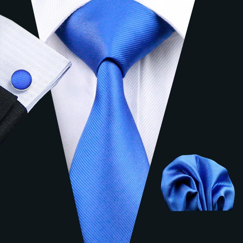 Hi-Tie Classic Blue Solid Silk Men's Tie Pocket Square Cufflinks Set