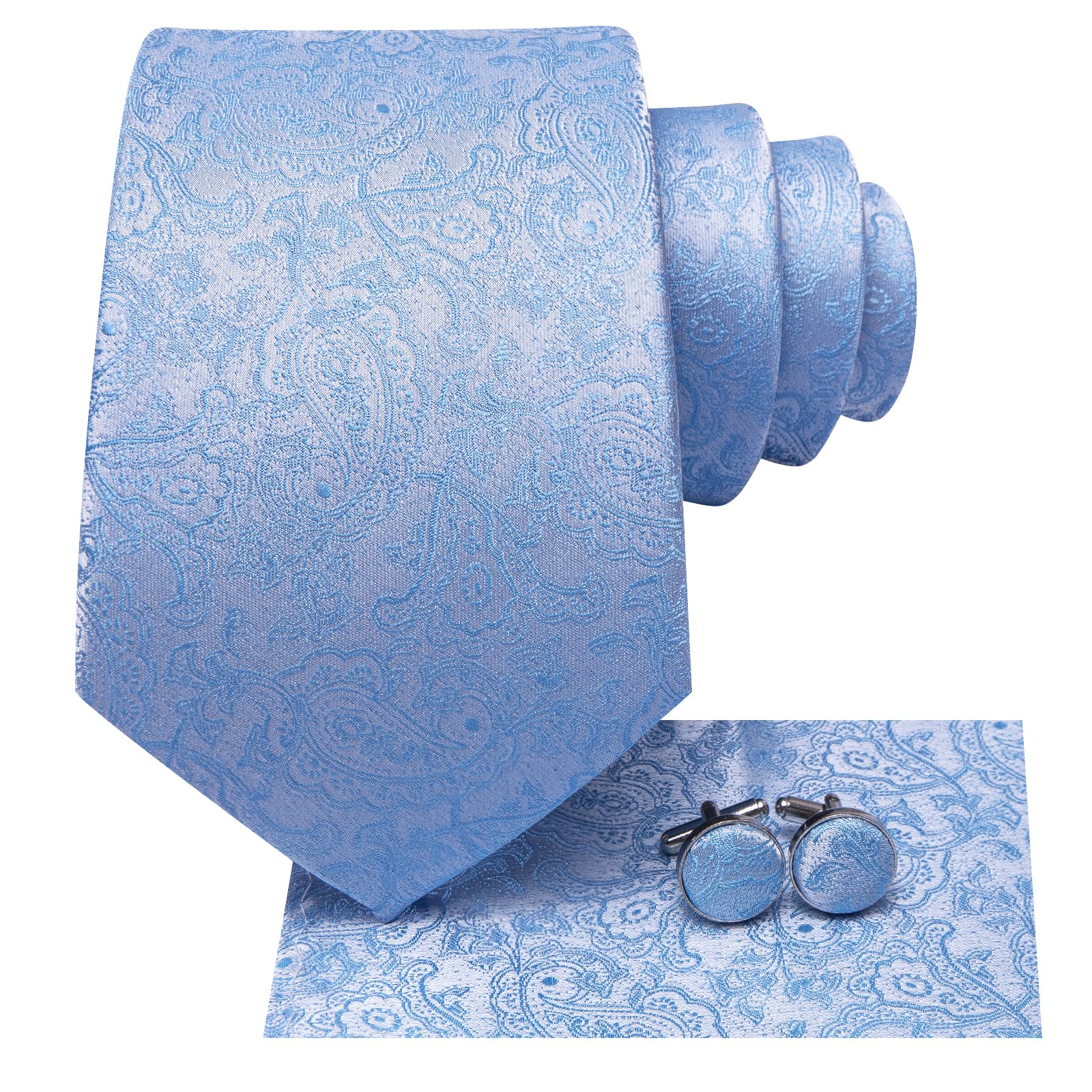 Hi-Tie Baby Blue Paisley Silk Mens Tie Handkerchief Cufflinks Set
