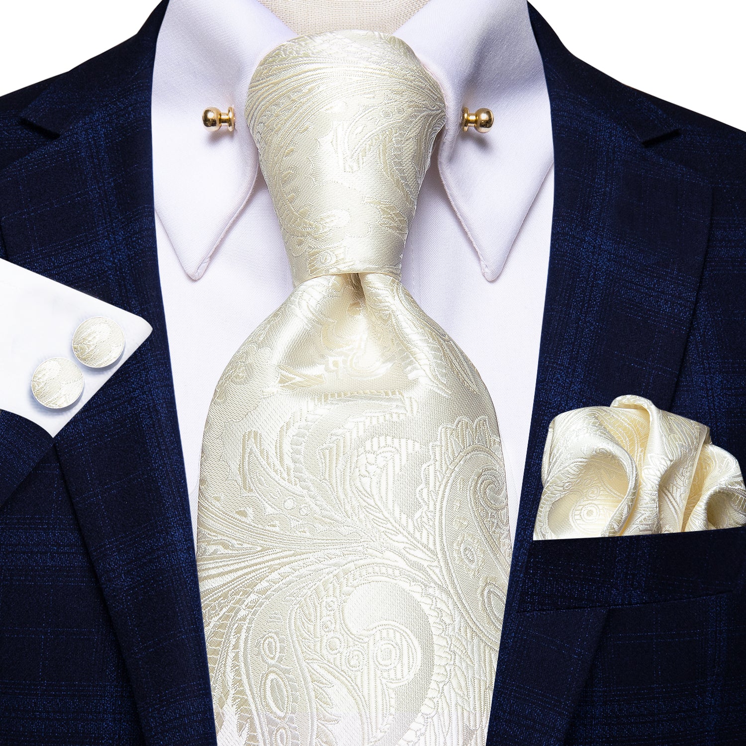 Hi-Tie Beige Paisley Men's Tie Pocket Square Cufflinks Set Collar Pin