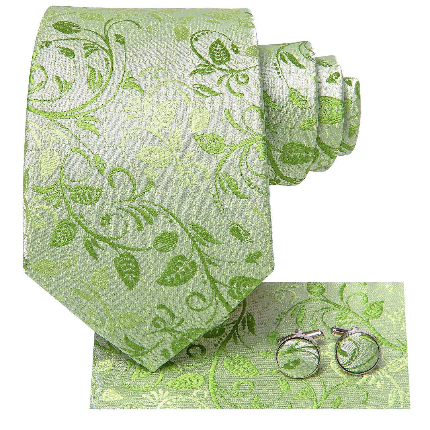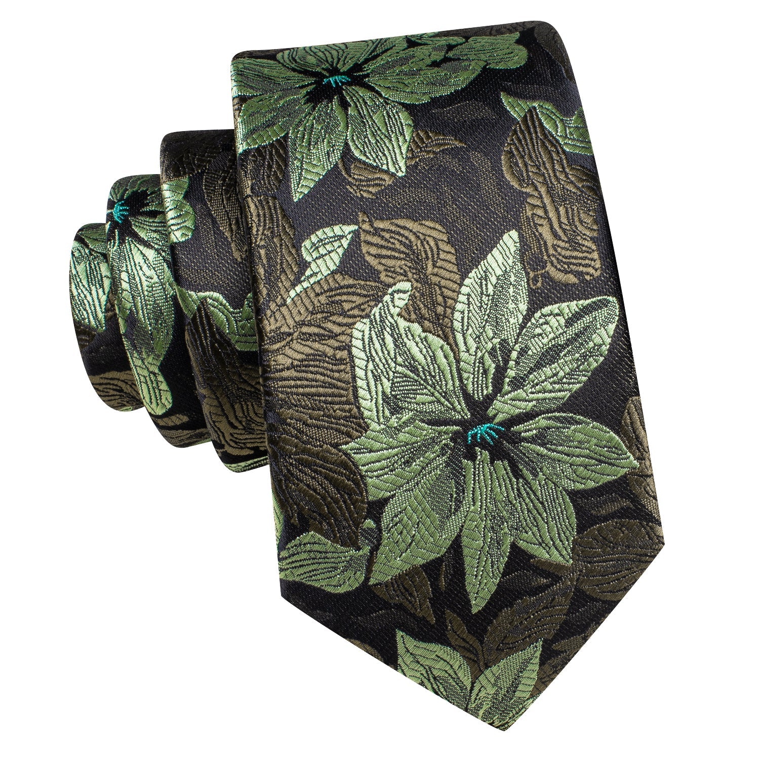Hi-Tie Necktie Black Green Floral Men Tie Pocket Square Cufflinks Set