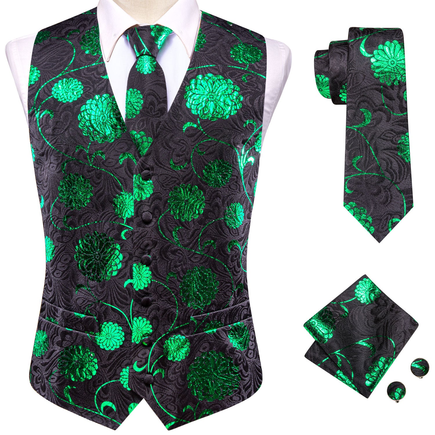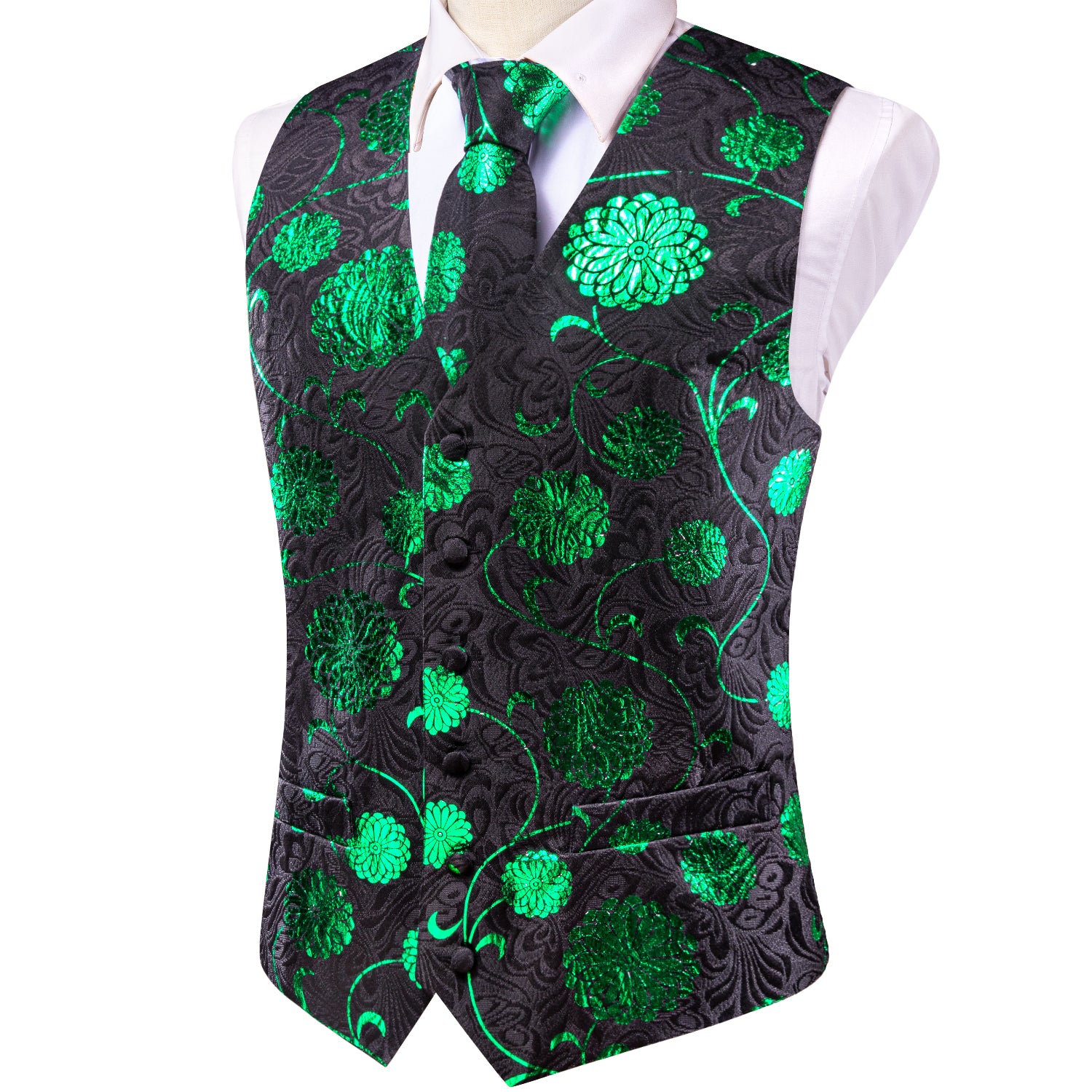 Hi-Tie Wedding Top Black Green Floral Men Vest Hanky Cufflinks Tie Set
