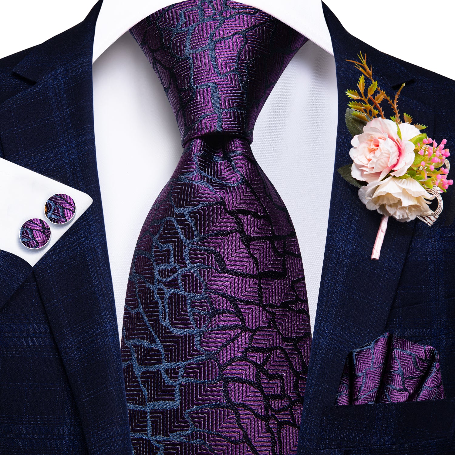 Dark Purple Black Plaid Tie Handkerchief Cufflinks Set with Wedding Brooch