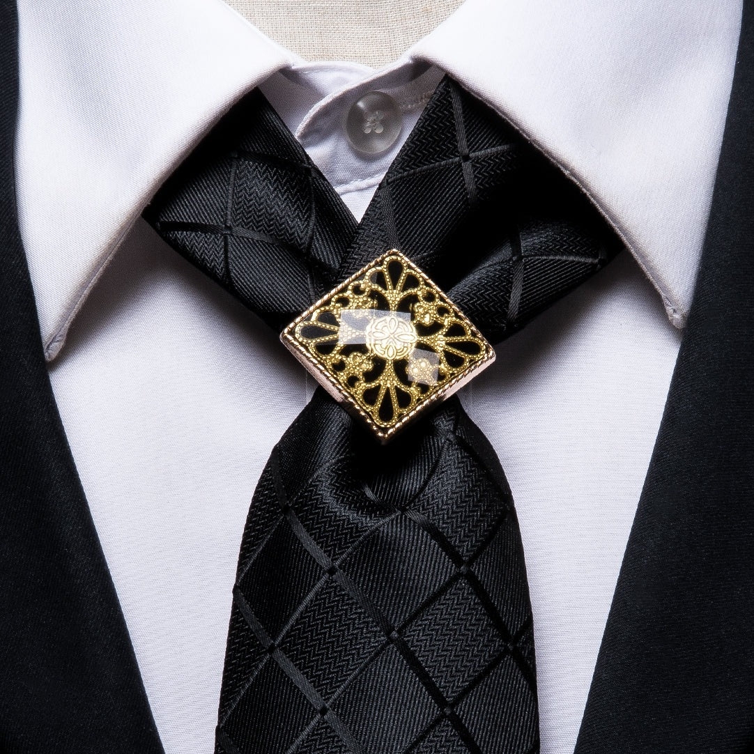 Classic Black Floral Silk Men's Tie Hanky Cufflinks Set with Brooch