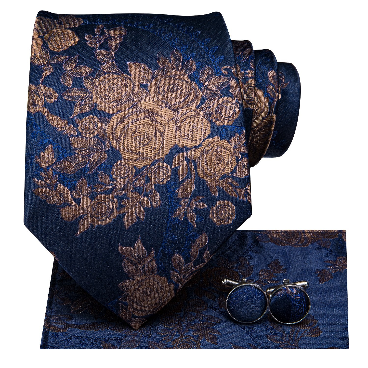 Classic Black Floral Silk Men's Tie Hanky Cufflinks Set With Golden Chain