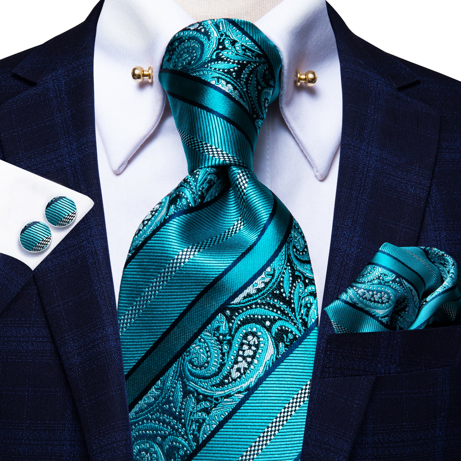 Hi-Tie Cyan Paisley Silk Men's Tie Hanky Cufflinks Set with Collar Pin