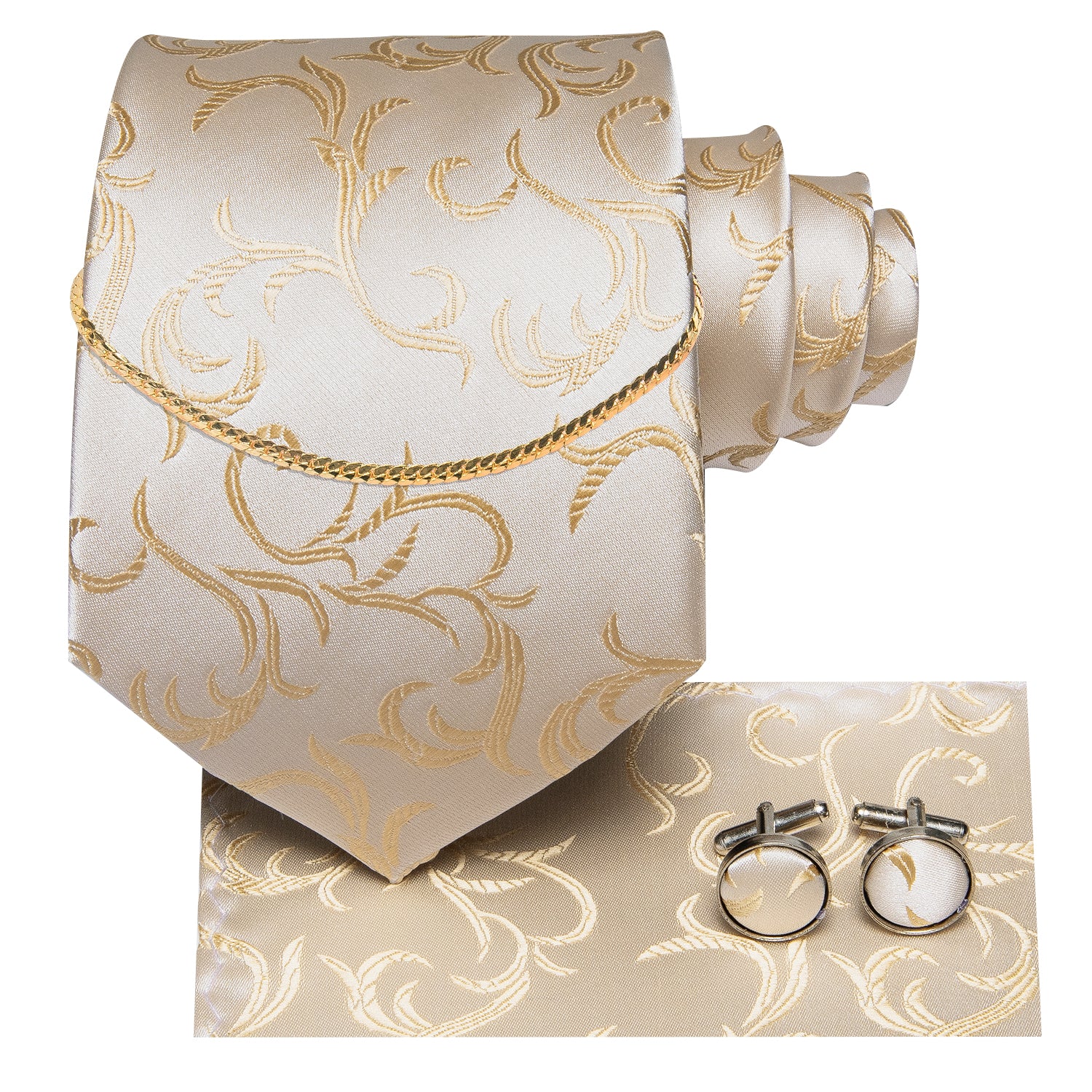 Champagne Silver Floral Tie Pocket Square Cufflinks Set With Golden Chain
