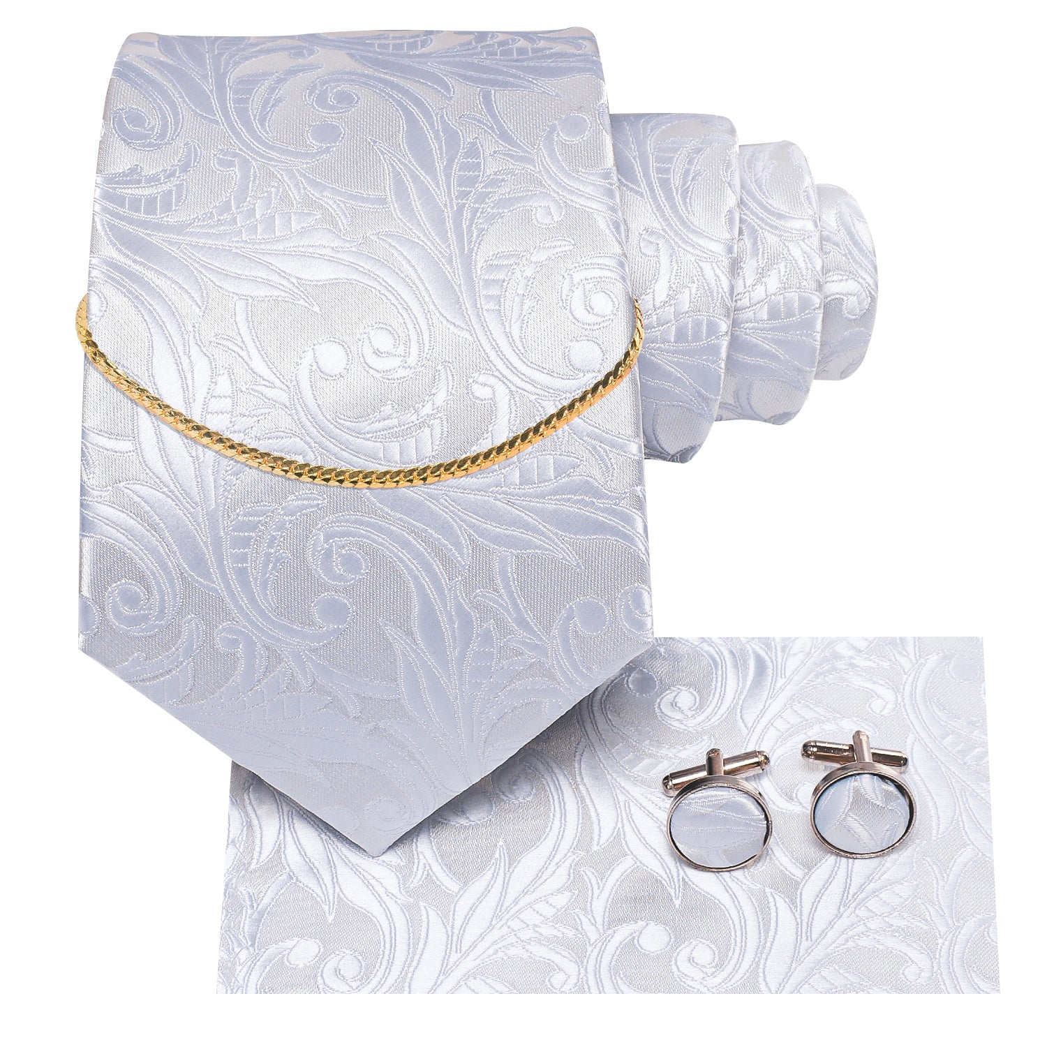 Hi-Tie White Floral Tie Pocket Square Cufflinks Set With Golden Chain