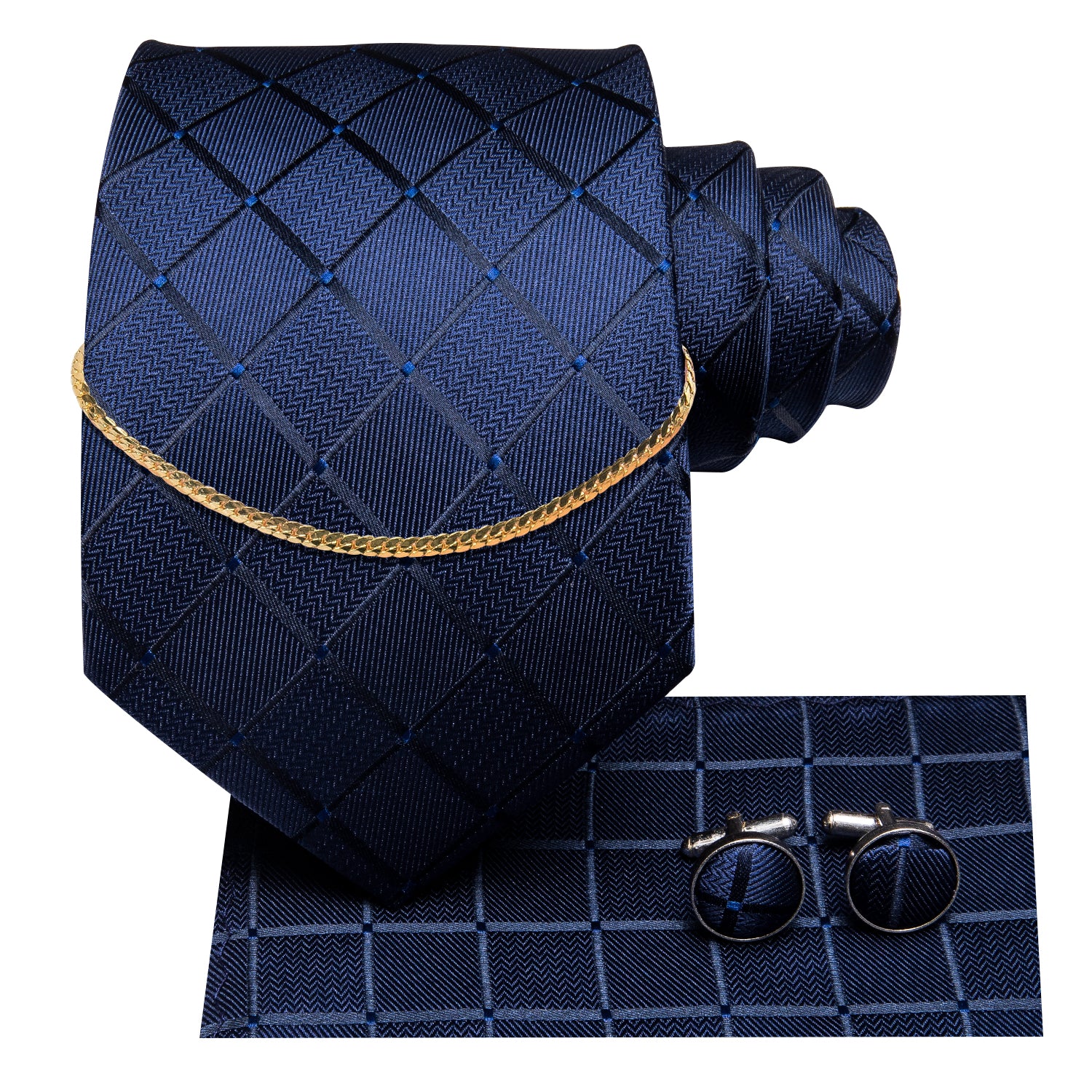 Navy Blue Checked Tie Pocket Square Cufflinks Set With Golden Chain