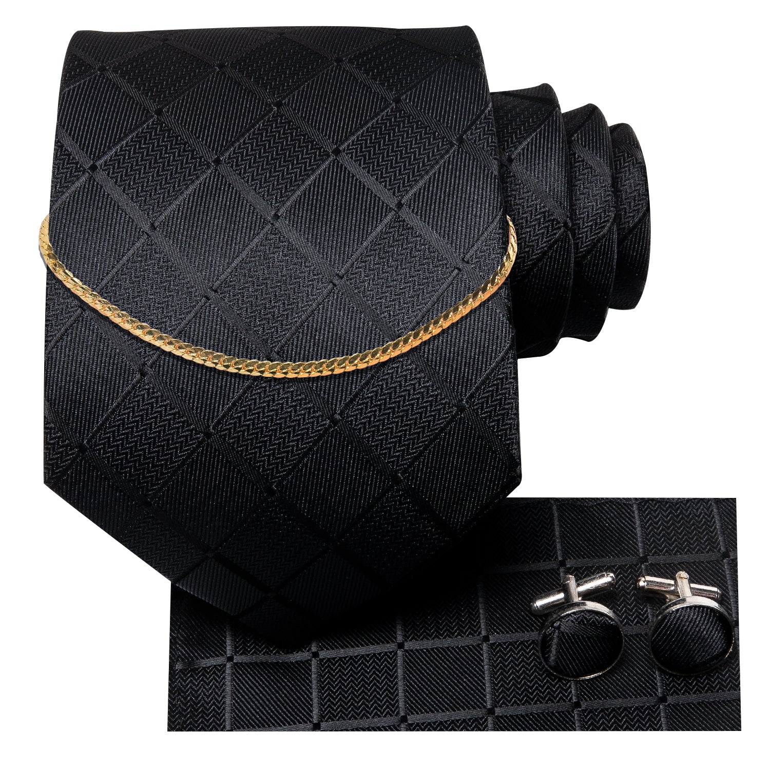 Pure Black Plaid Silk Men's Tie Set Tie Pocket Square Cufflinks Set With Golden Chain