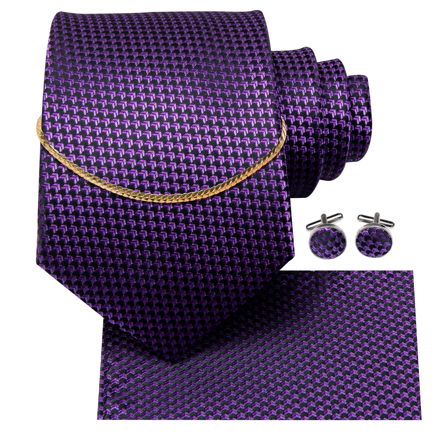Purple Plaid Men's Necktie Pocket Square Cufflinks Set With Golden Chain