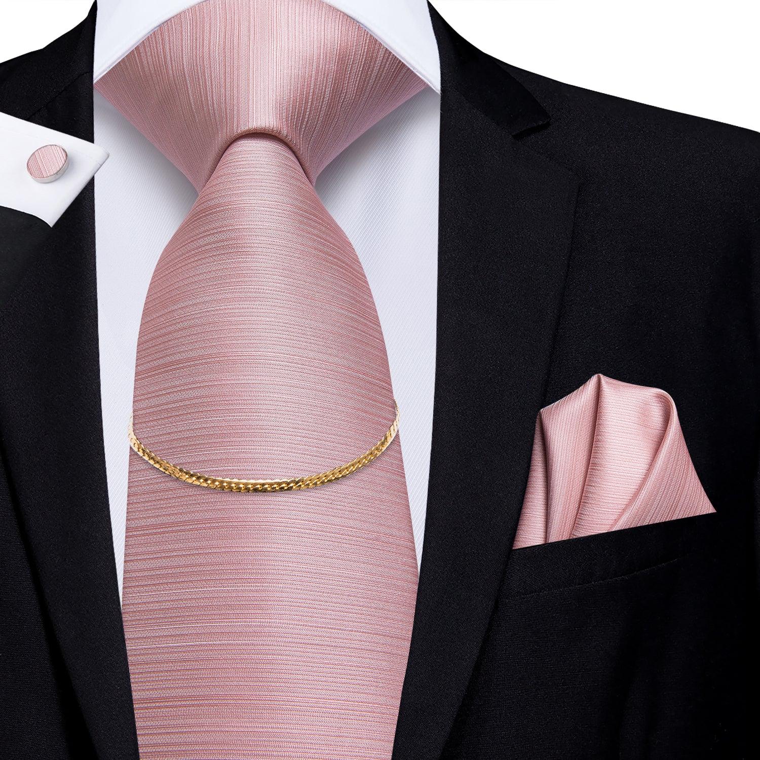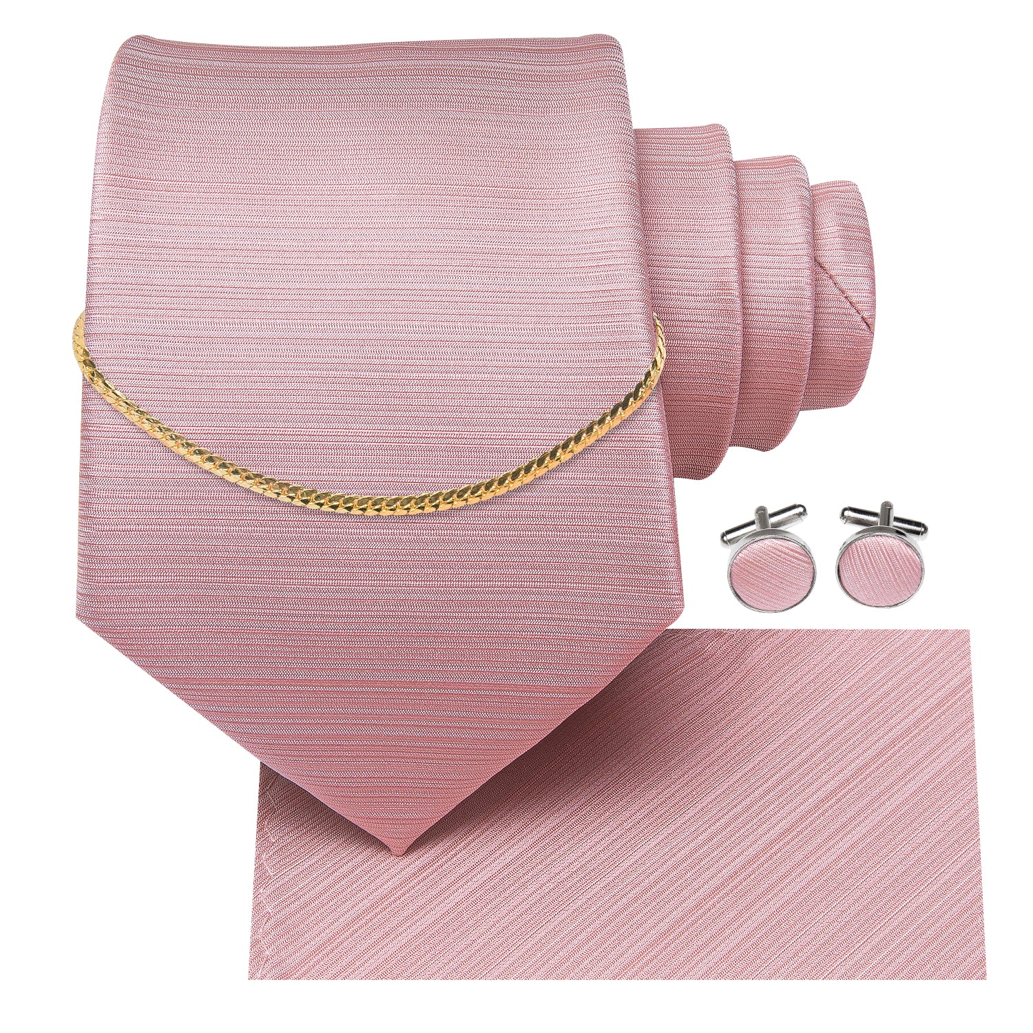 Hi-Tie Baby Pink Solid Tie Pocket Square Cufflinks Set Golden Chain