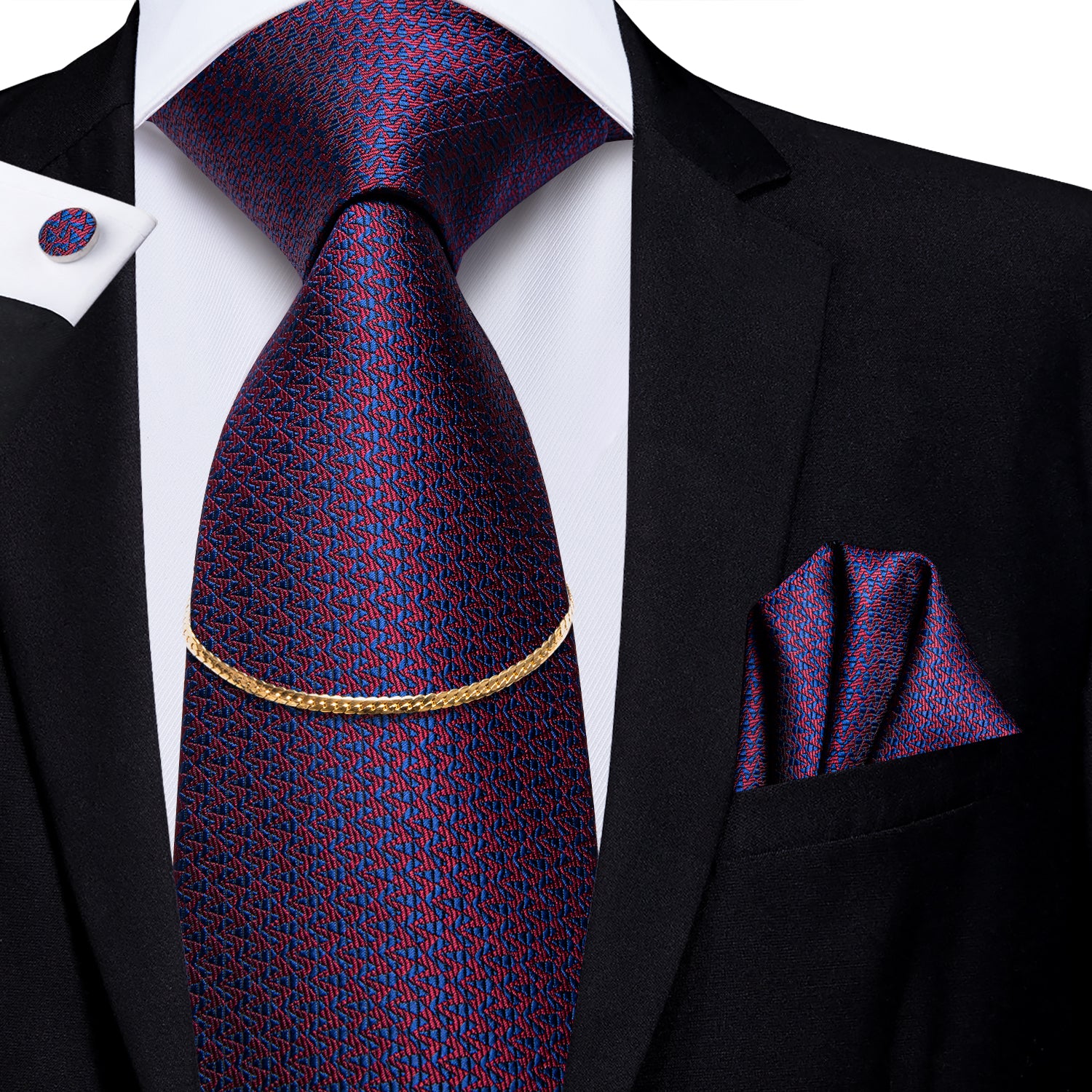 Red Blue Striped Silk Men's Silk Tie Hanky Cufflinks Set With Golden Chain