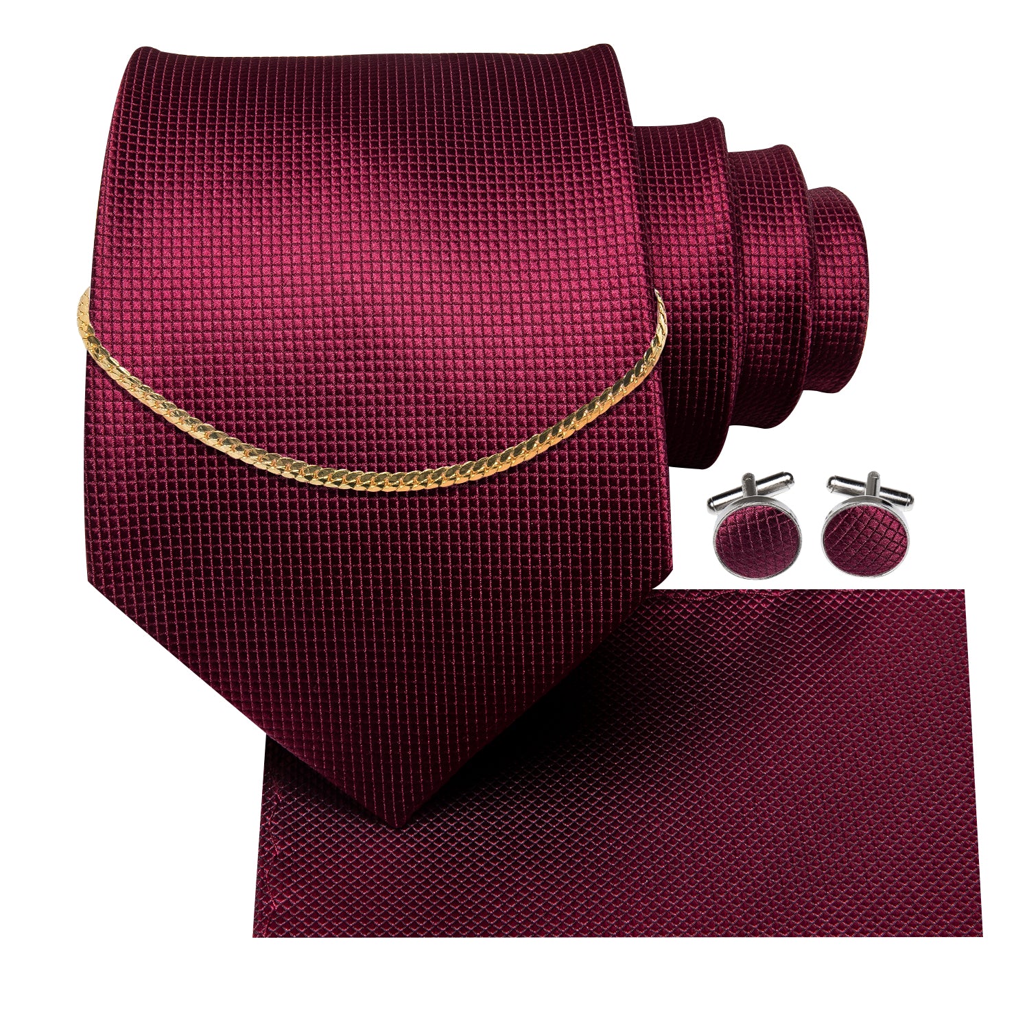 Red Solid Men's Tie Pocket Square Cufflinks Set With Golden Chain