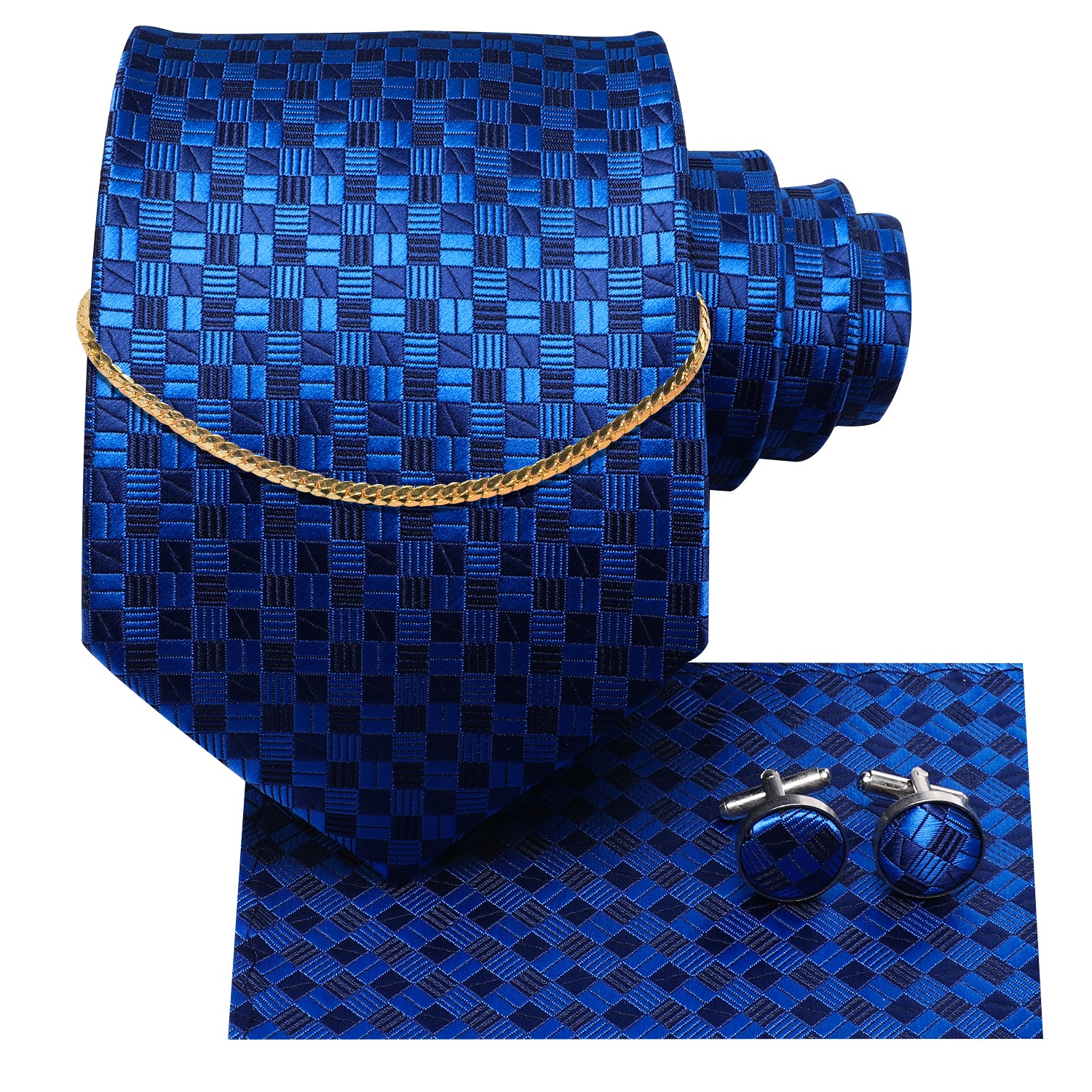 Blue Novelty Plaid Tie Set Silk Tie Hank Cufflinks Set With Golden Chain