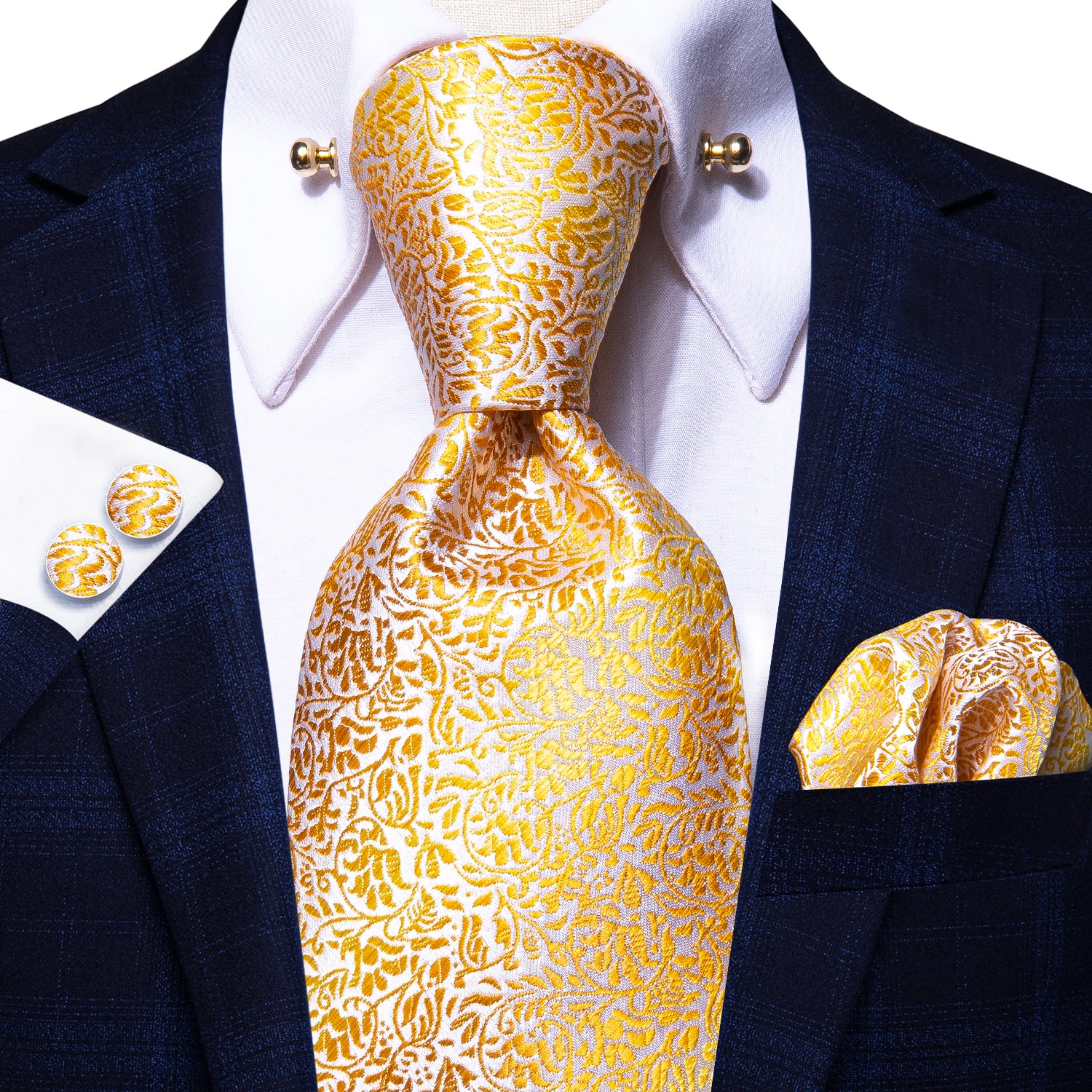 Hi-Tie Gold Leaves Silk Tie Handkerchief Cufflinks Set with Collar Pin
