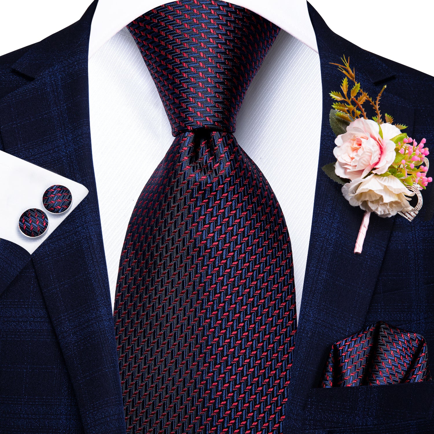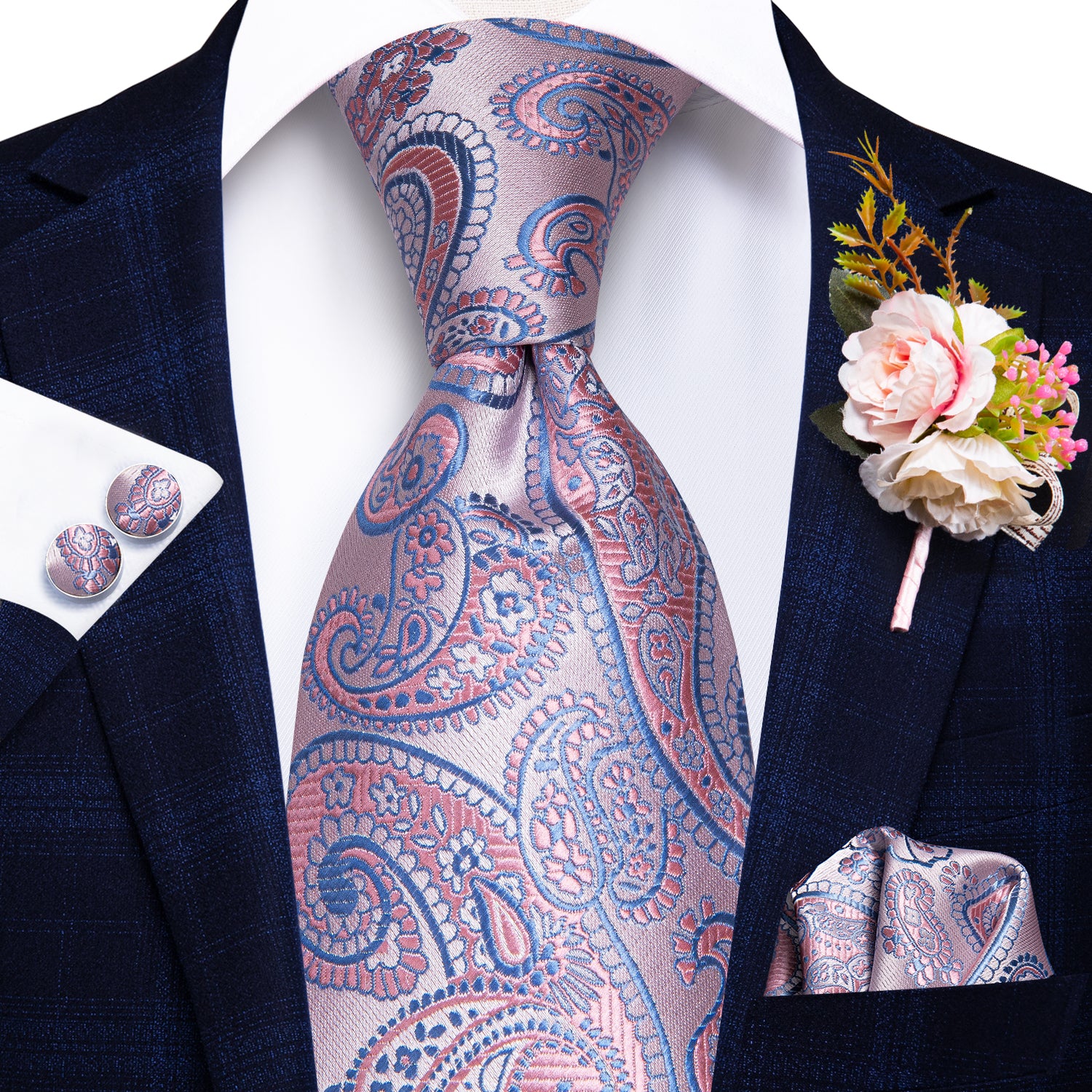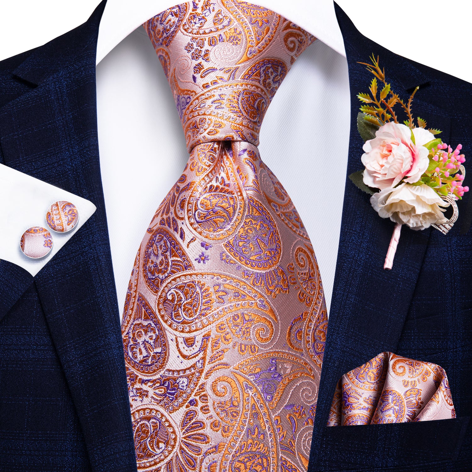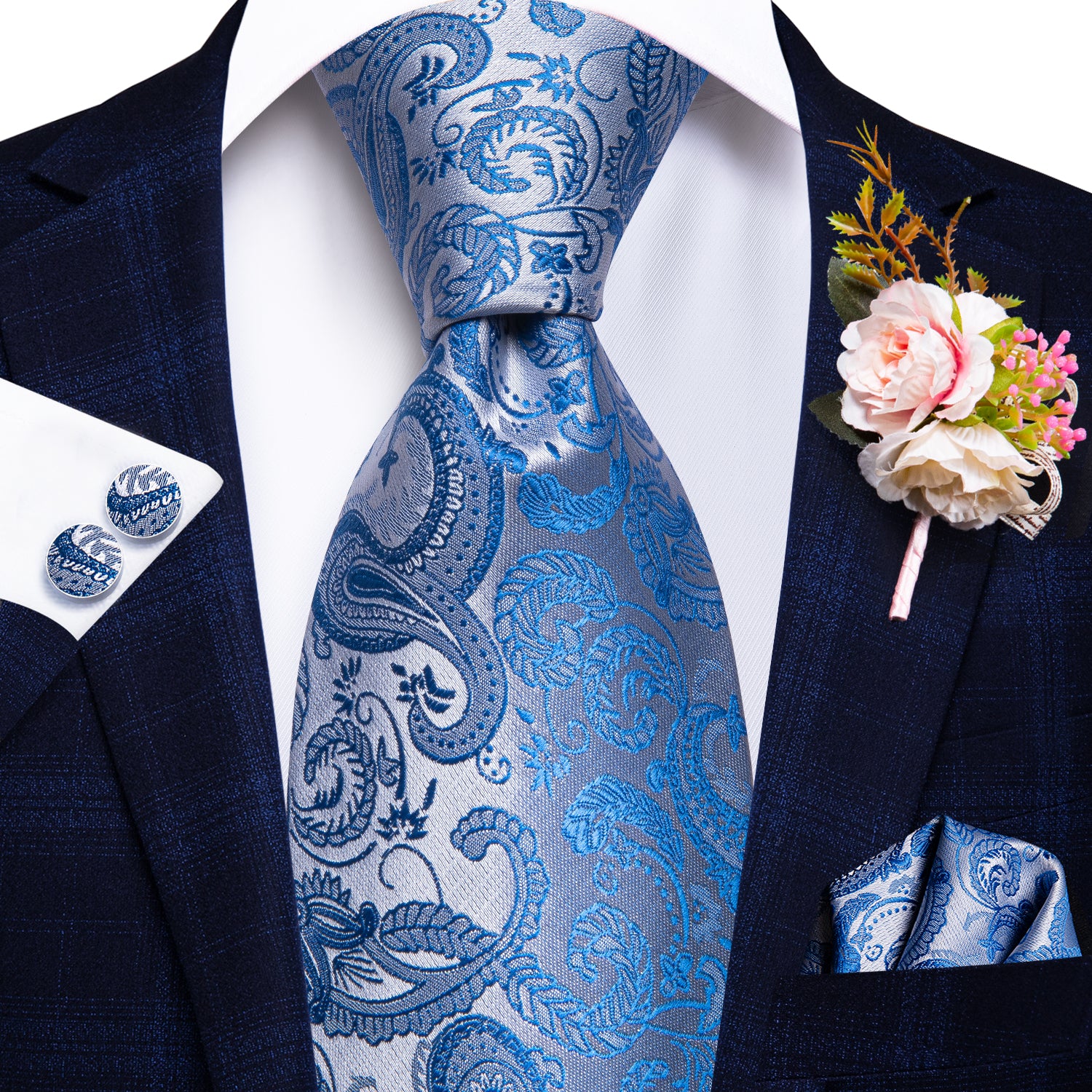 Hi-Tie Beautiful Plaid Tie Handkerchief Cufflinks Set Wedding Brooch