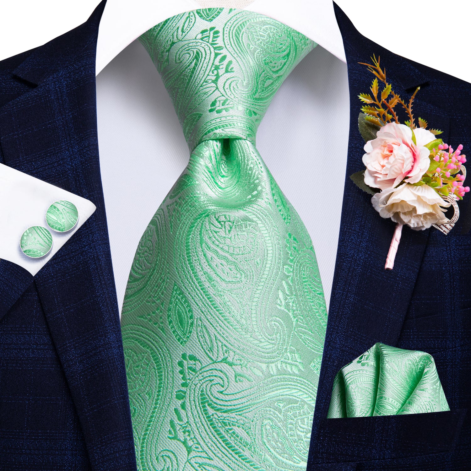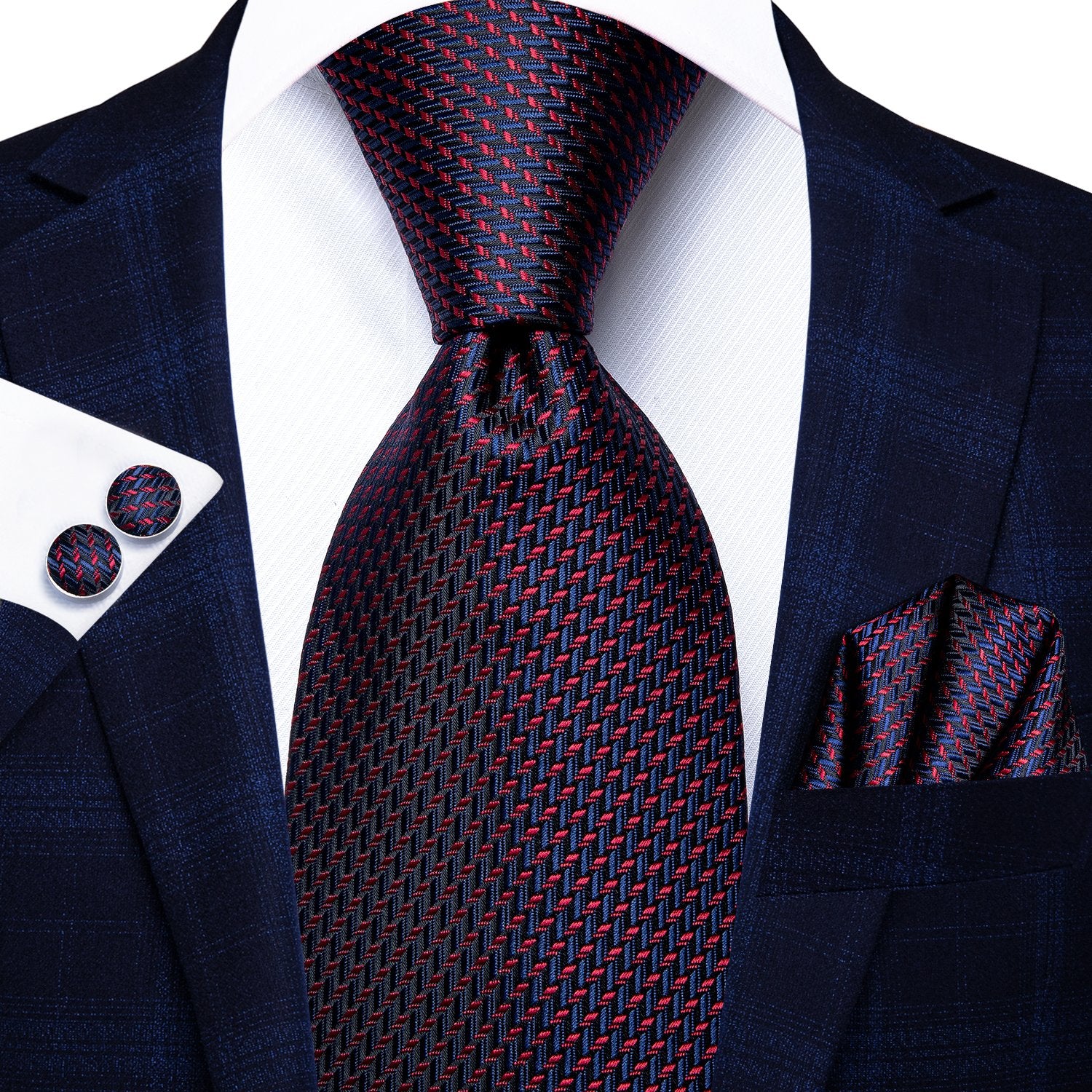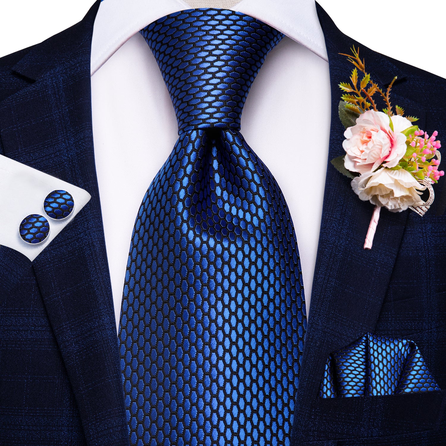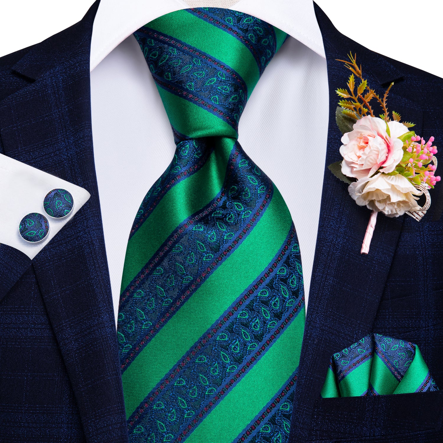 Hi-Tie Beautiful Plaid Tie Handkerchief Cufflinks Set Wedding Brooch