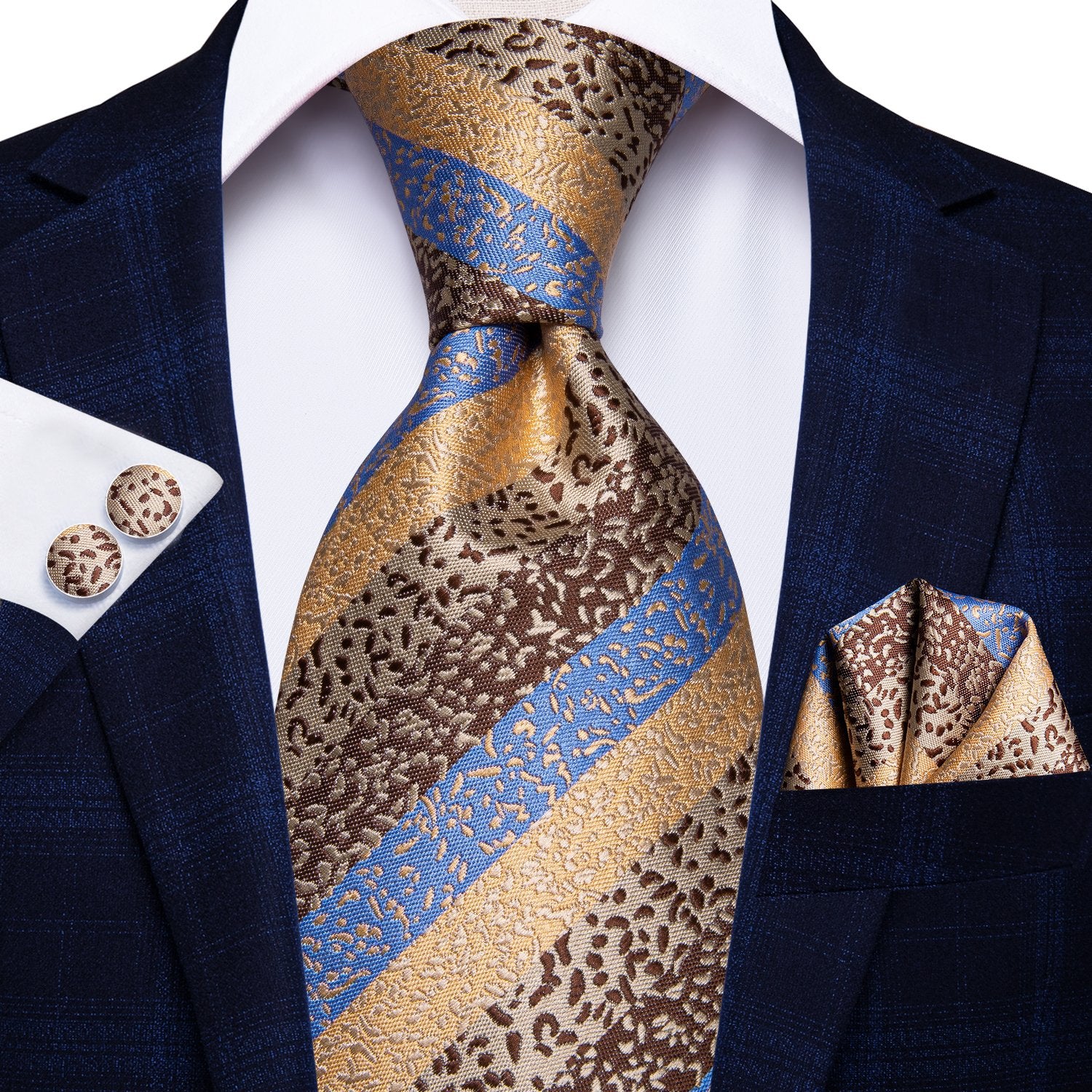 Hi-Tie Blue Yellow Polka Dot Tie Hanky Cufflinks Set Wedding Brooch