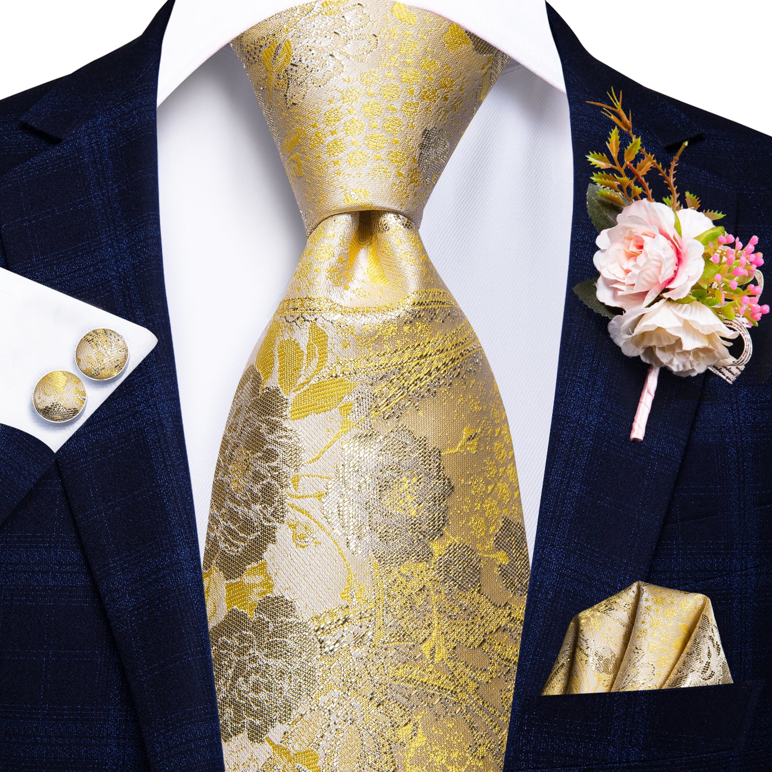 Hi-Tie Black Blue Yellow Floral Tie Hanky Cufflinks Set Wedding Brooch