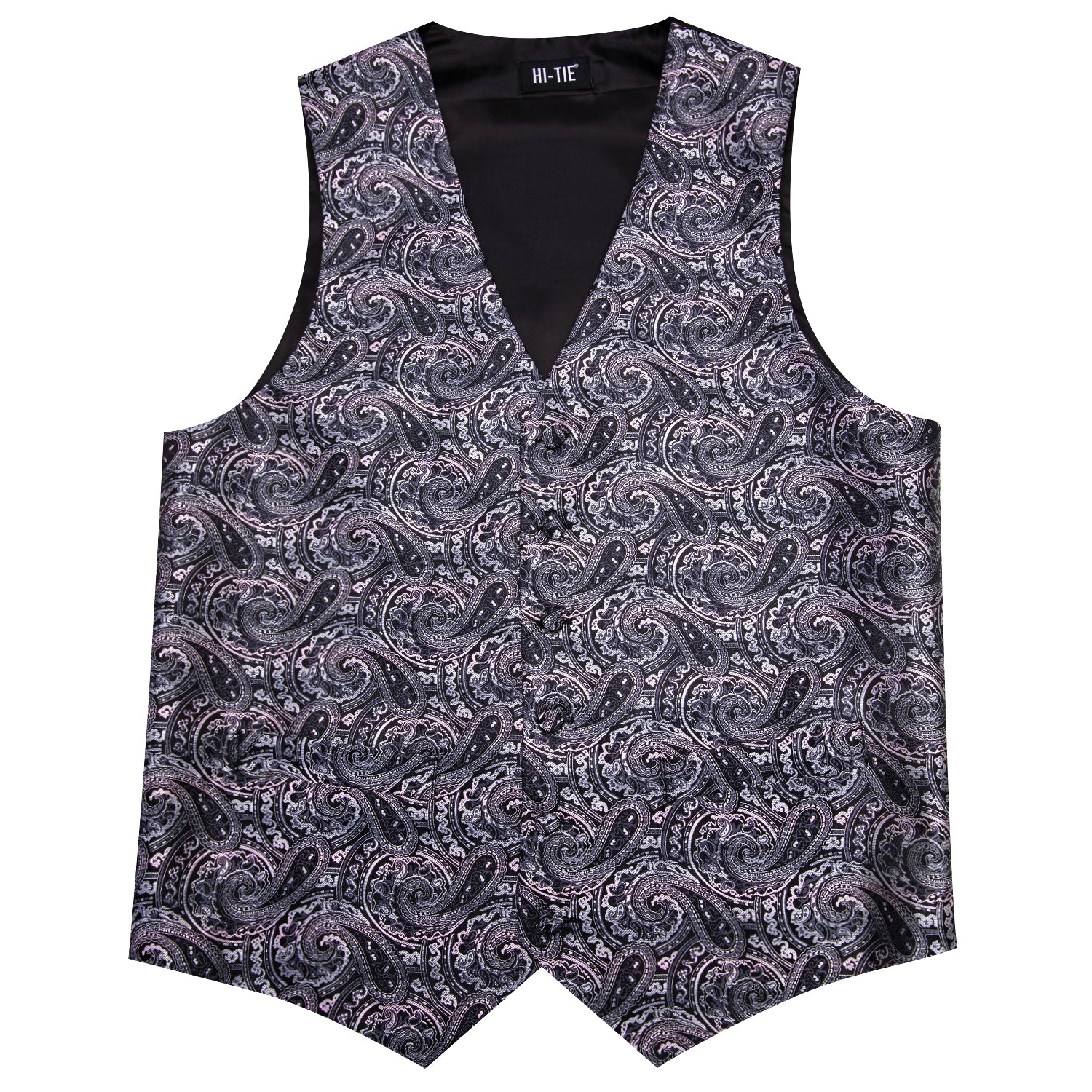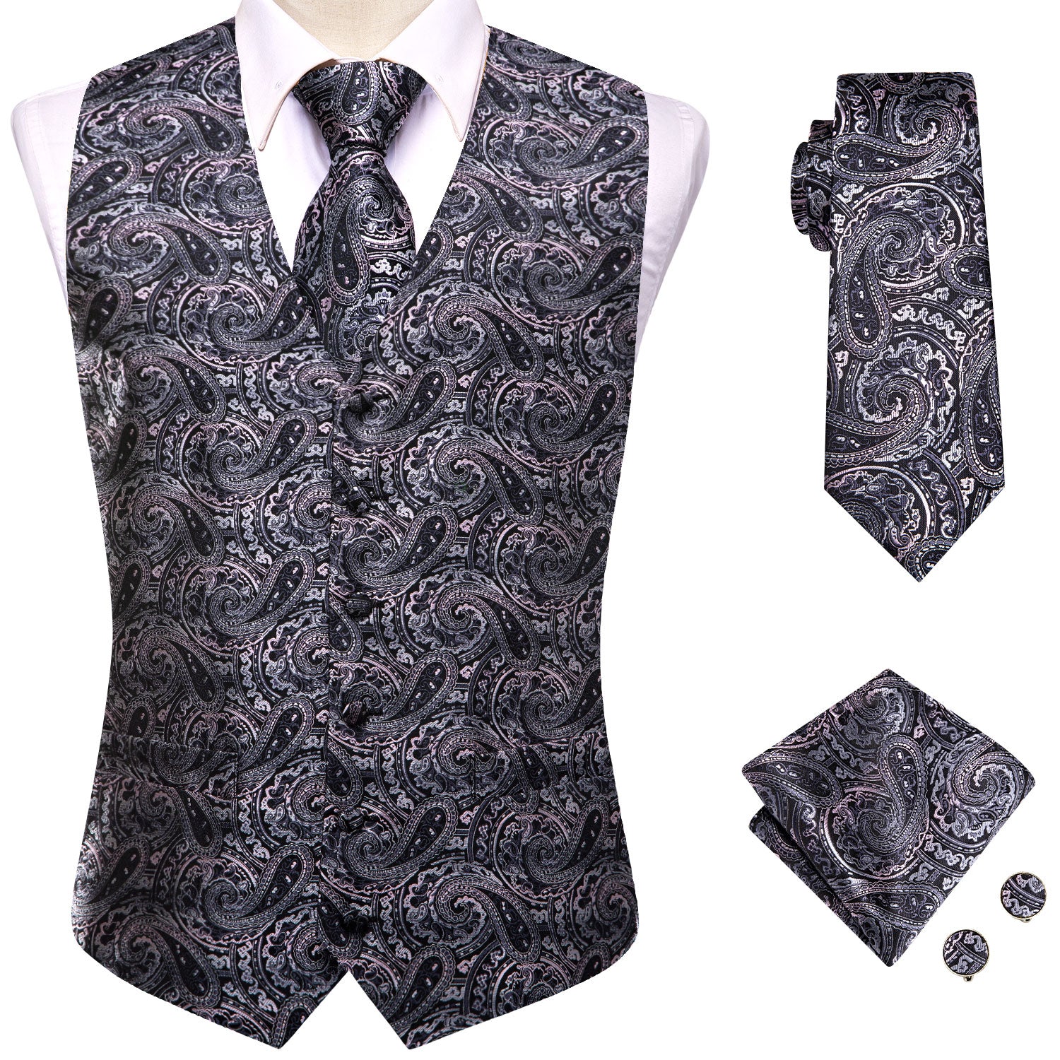 Grey Black Pink Paisley Men's Vest Hanky Cufflinks Tie Set Party