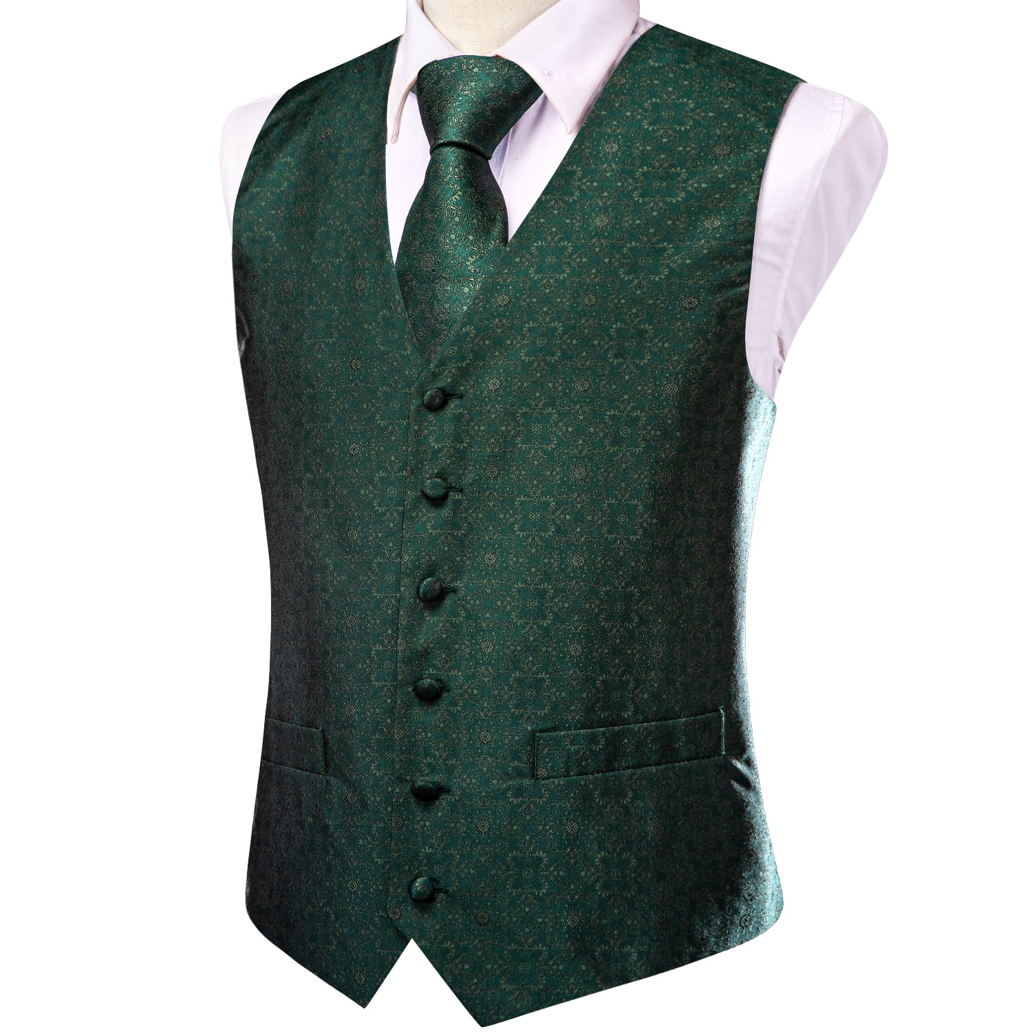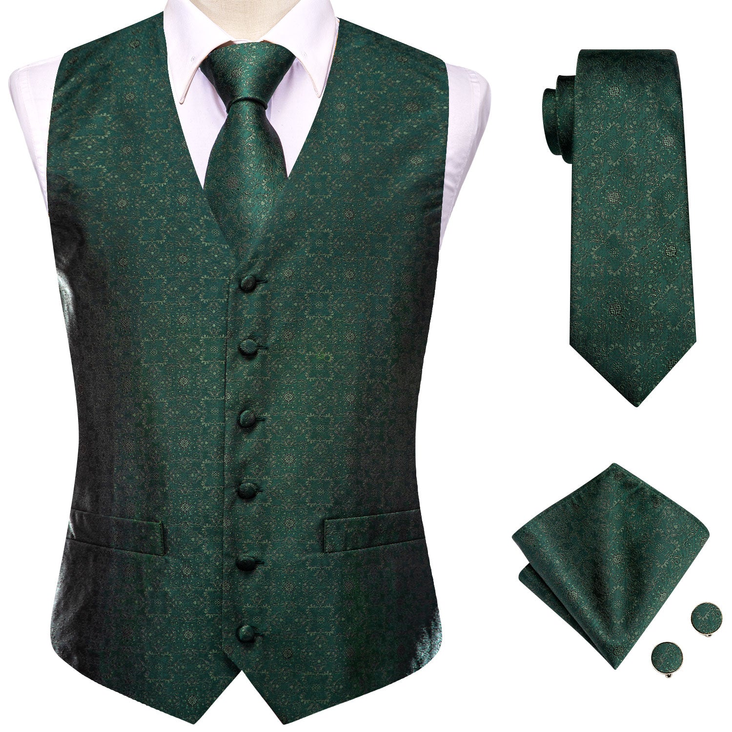Hi-Tie Wedding Top Black Green Floral Men Vest Hanky Cufflinks Tie Set