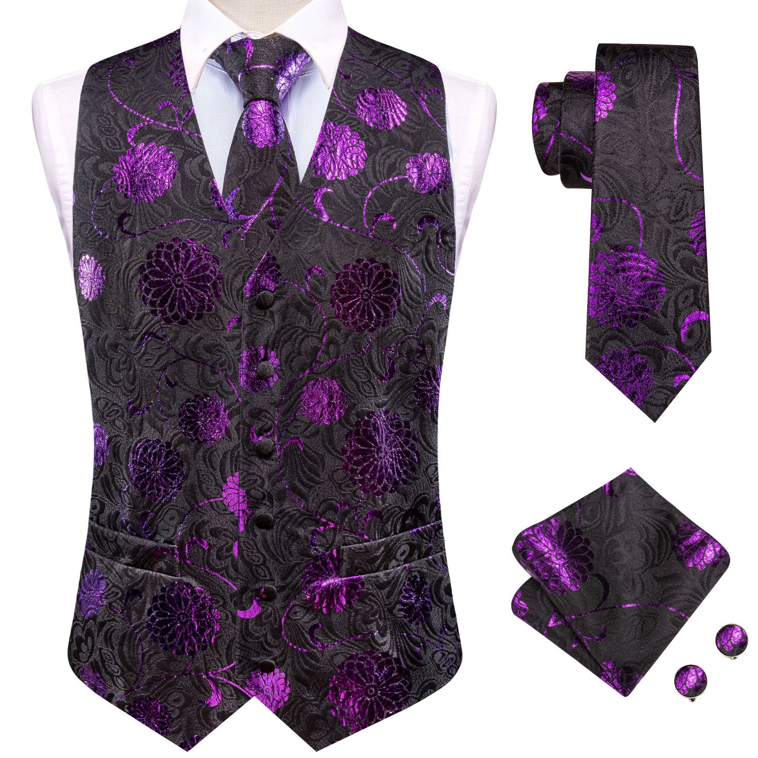 Hi-Tie Black Waistcoat Purple Floral Mens Vest Hanky Cufflinks Tie Set