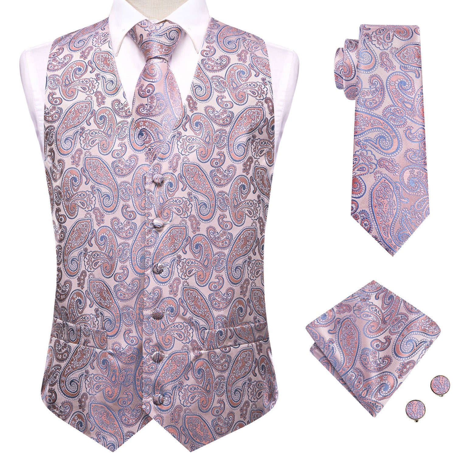 Light Coral Pink Paisley Men's Vest Hanky Cufflinks Tie Set