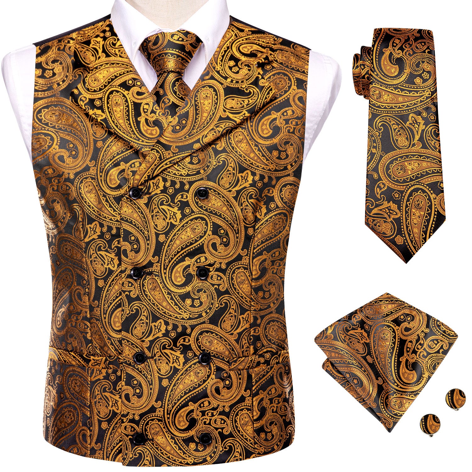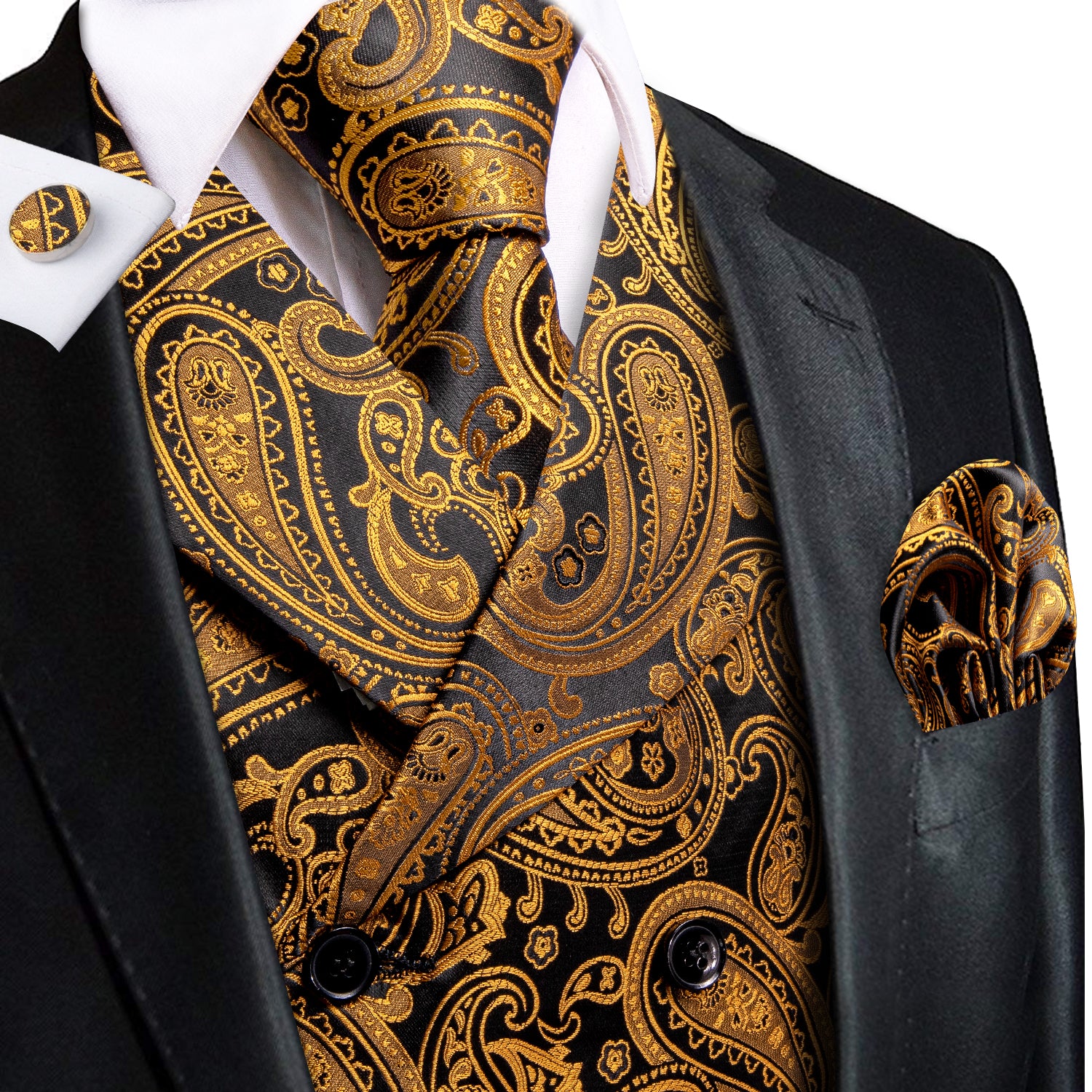 Hi-Tie Black Gold Paisley Men's Collar Vest Hanky Cufflinks Tie Set