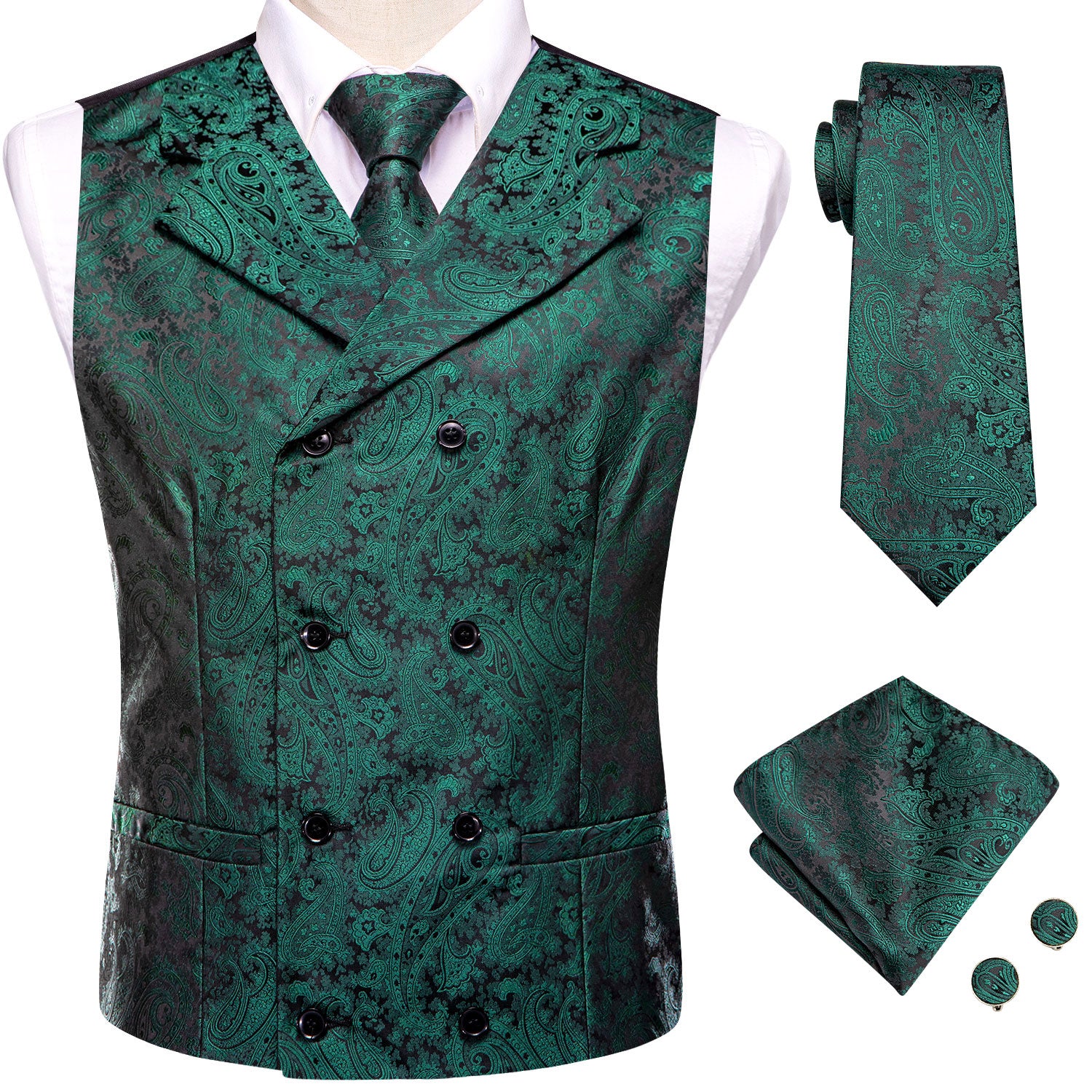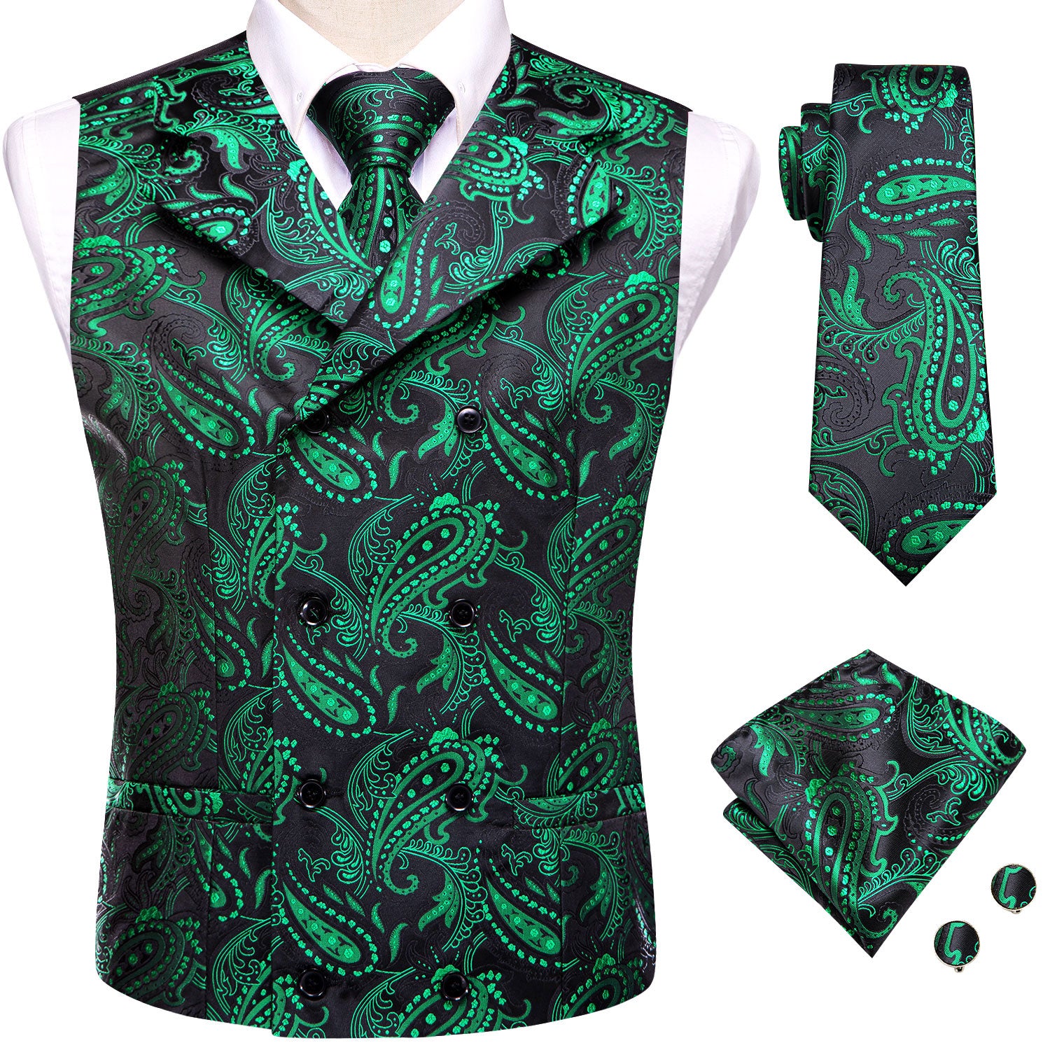 Hi-Tie Black Green Paisley Men's Collar Vest Hanky Cufflinks Tie Set