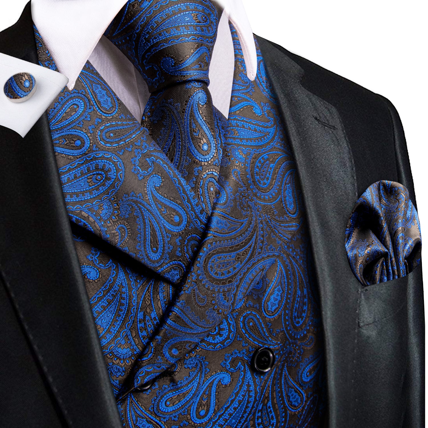 Hi-Tie Black Blue Paisley Men's Collar Vest Hanky Cufflinks Tie Set