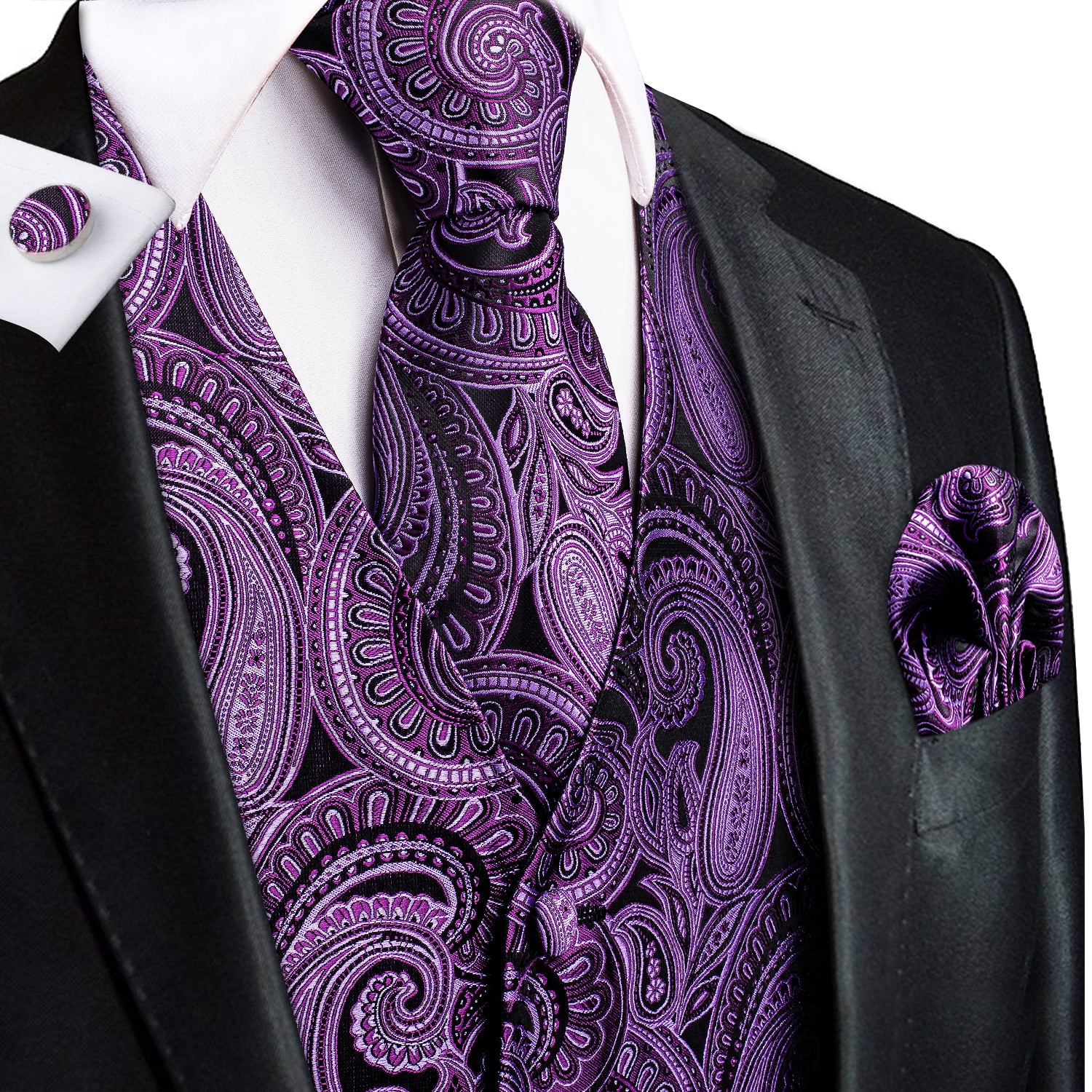 Hi-Tie Black Purple Paisley Silk Men's Vest Hanky Cufflinks Tie Set