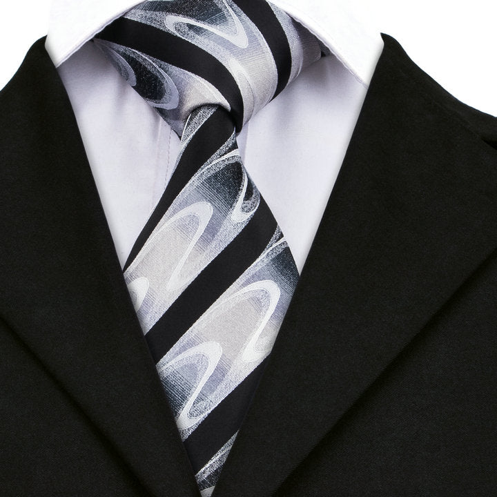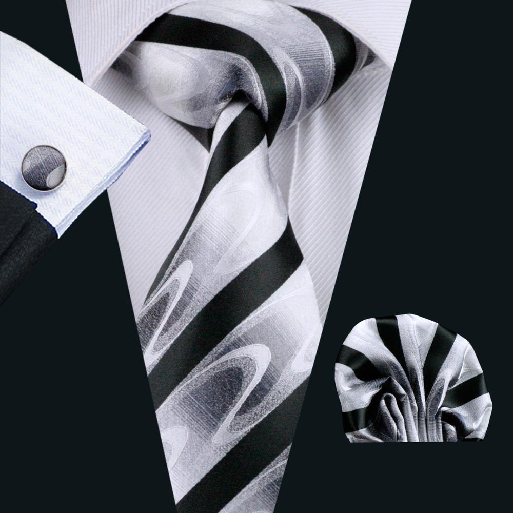 Sold outHigh Quality & Affordable Men's Tie, 100% Silk Tie and Discount Cheap Necktie,Free shipping. Men's fashion tie set. Best selling. More popular ties.Hi-Tie Black White Wave Striped Silk Men's Tie Pocket Square Cufflinks Set
