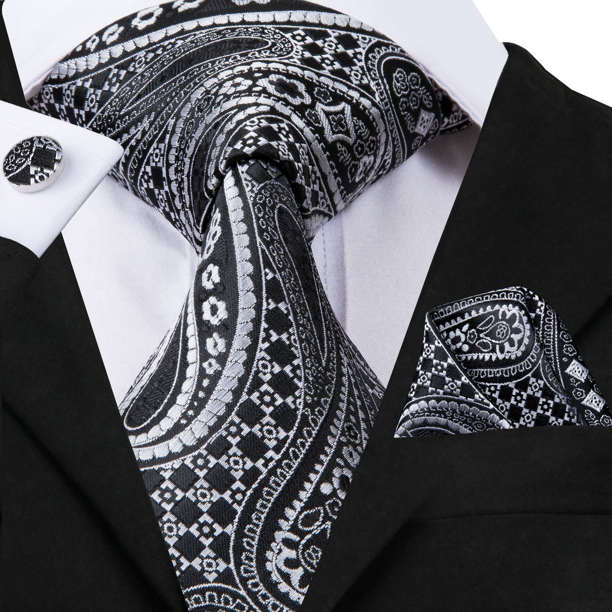 Black White Paisley Necktie Pocket Square Cufflinks SetBlack White Paisley Necktie Pocket Square Cufflinks Set