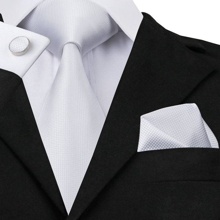 Sold outWhite Necktie Silver Plaid Dot Tie Pocket Square Cufflinks SetWhite Necktie Silver Plaid Dot Tie Pocket Square Cufflinks Set