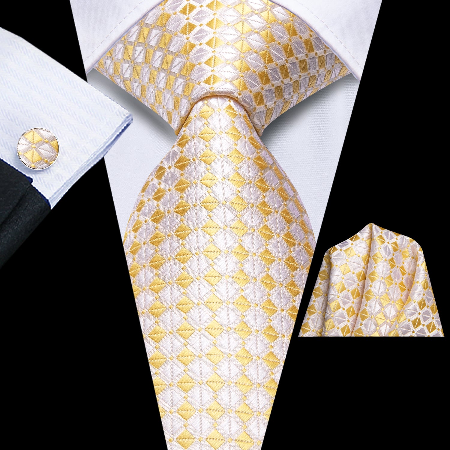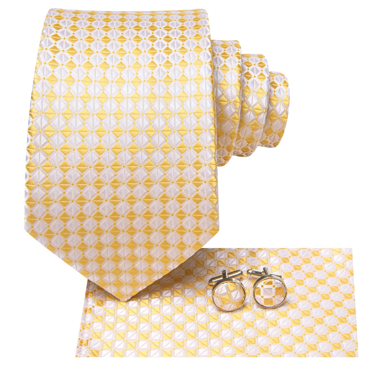 Sold outHi-Tie Yellow White Plaid Silk Tie Pocket Square Cufflinks Setgold mens tie
