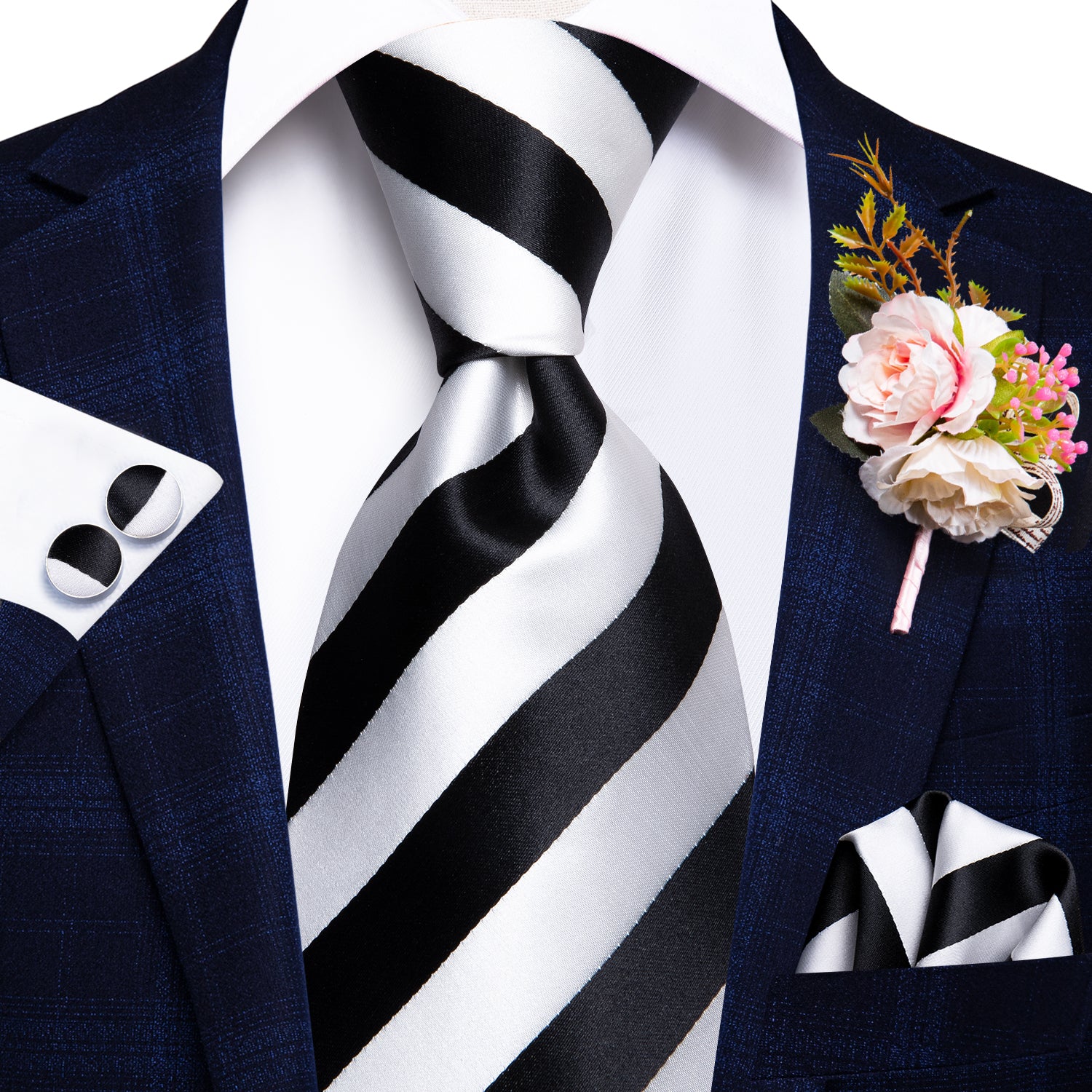 Sold outWhite Black Striped Tie Tie Handkerchief Cufflinks Set with Wedding BroochWhite Black Striped Tie Tie Handkerchief Cufflinks Set with Wedding Brooch