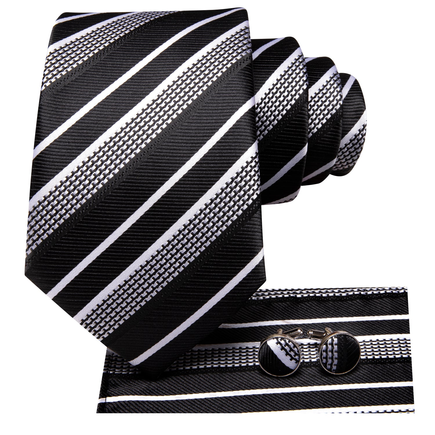 Men's Black White Striped Necktie Pocket Square Cufflinks Set Men's Black White Striped Necktie Pocket Square Cufflinks Set
