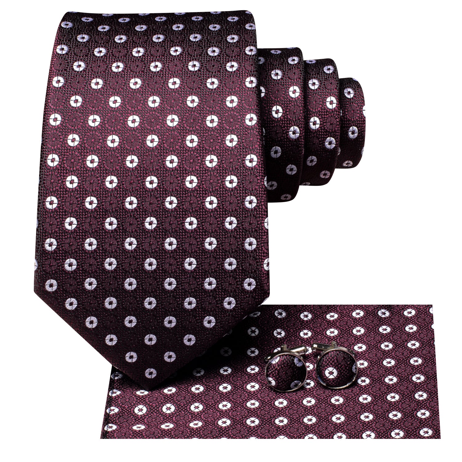 Burgundy Red White Circle Silk Tie Pocket Square Cufflinks Set navy blue suit with burgundy tiered tie men