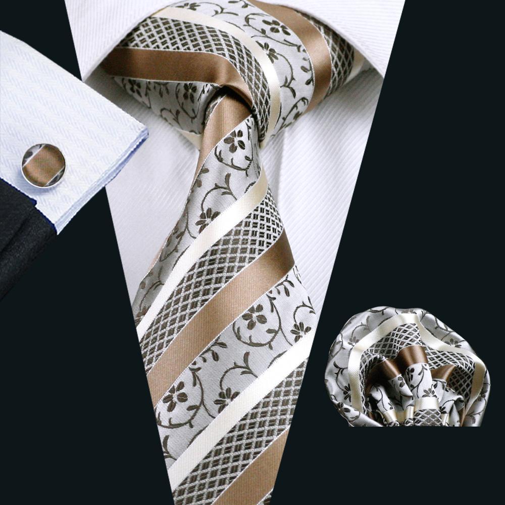 Hi-Tie Blue Brown White Striped Tie Handkerchief Cufflinks Set with Wedding BroochHi-Tie Blue Brown White Striped Tie Handkerchief Cufflinks Set with Wedding Brooch
