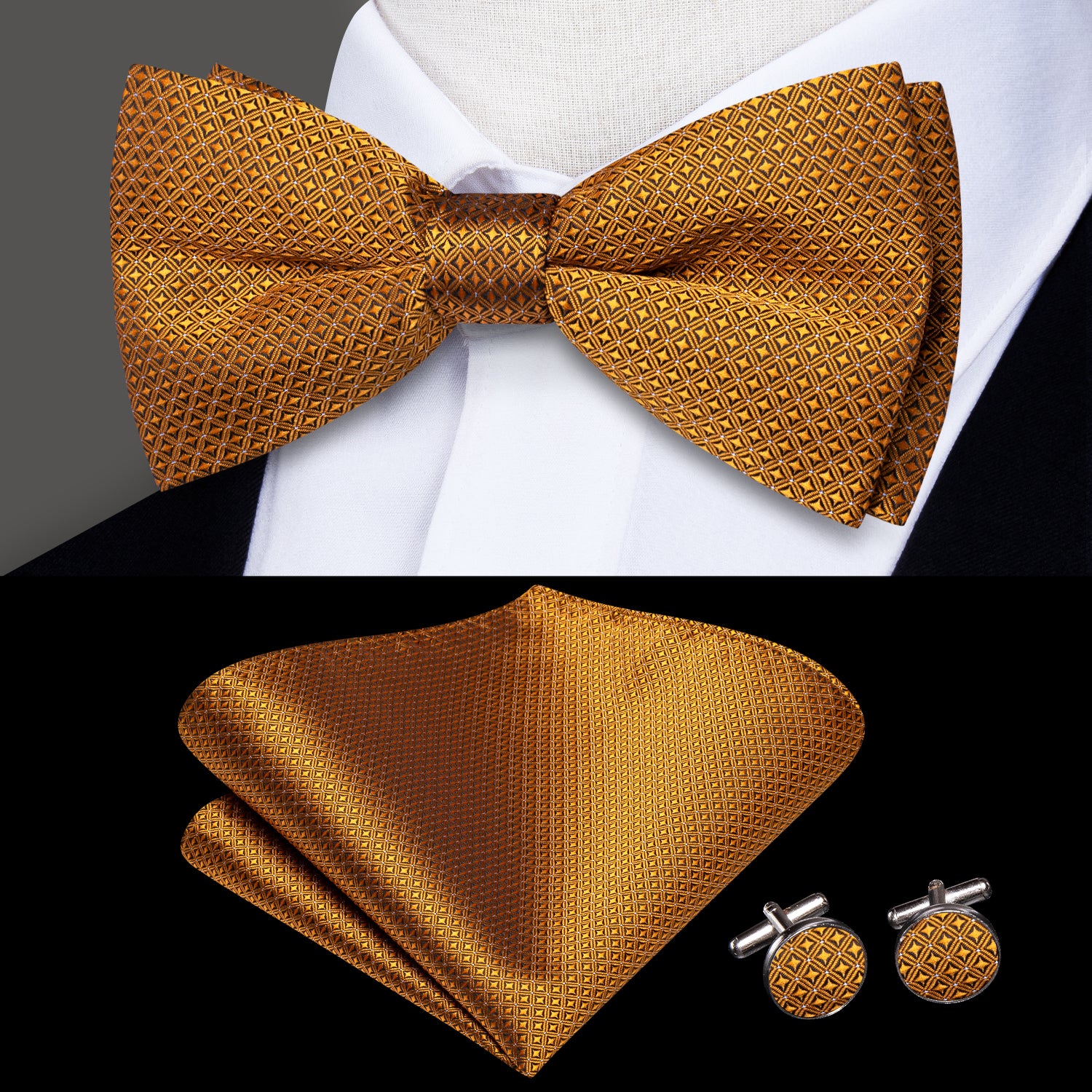 - Included: Men's Bow Tie + Pocket Square + Cufflinks