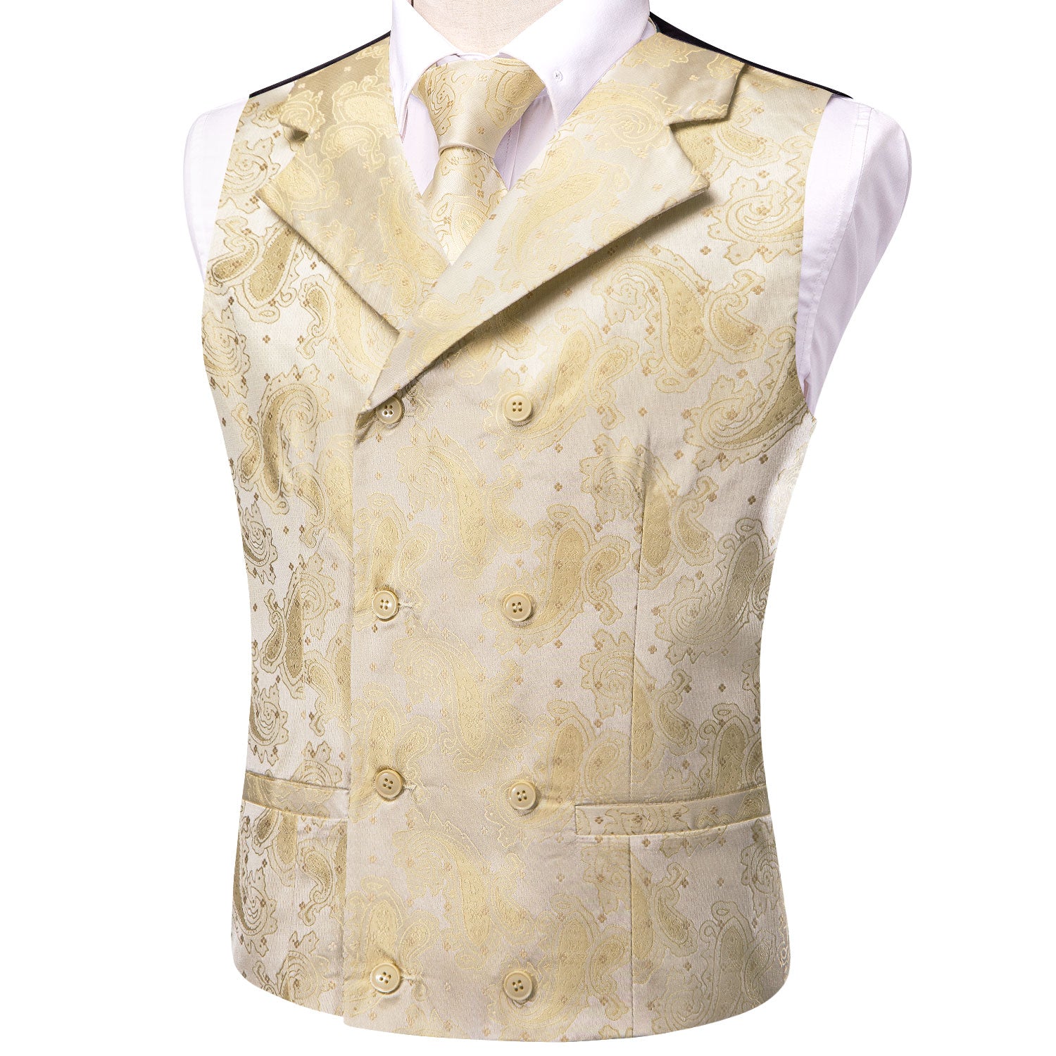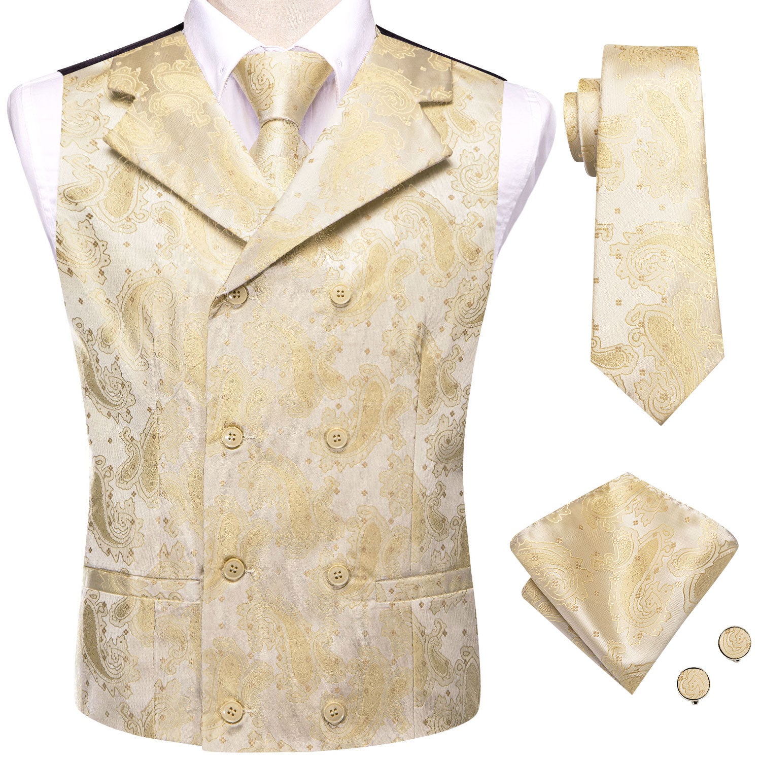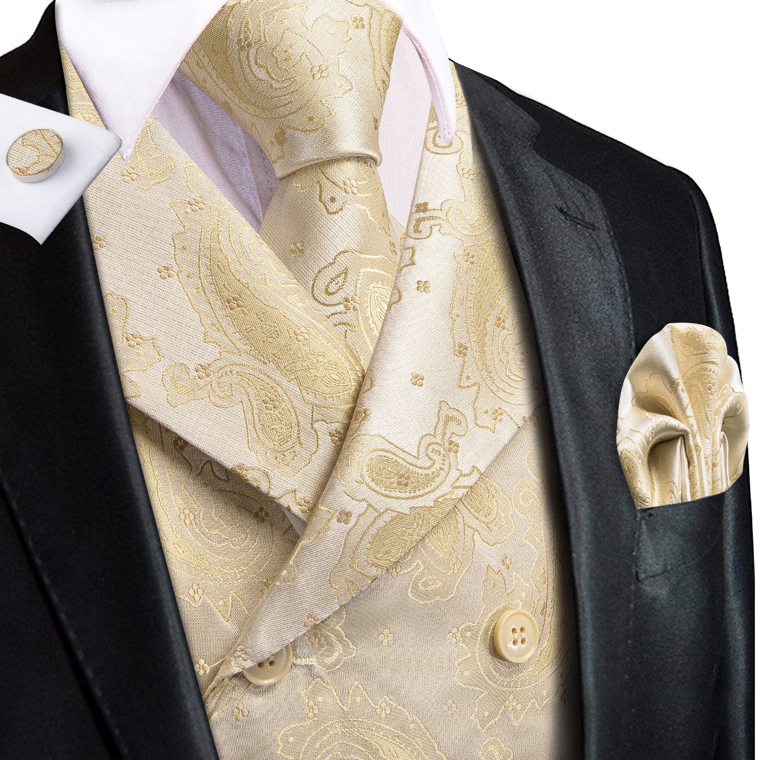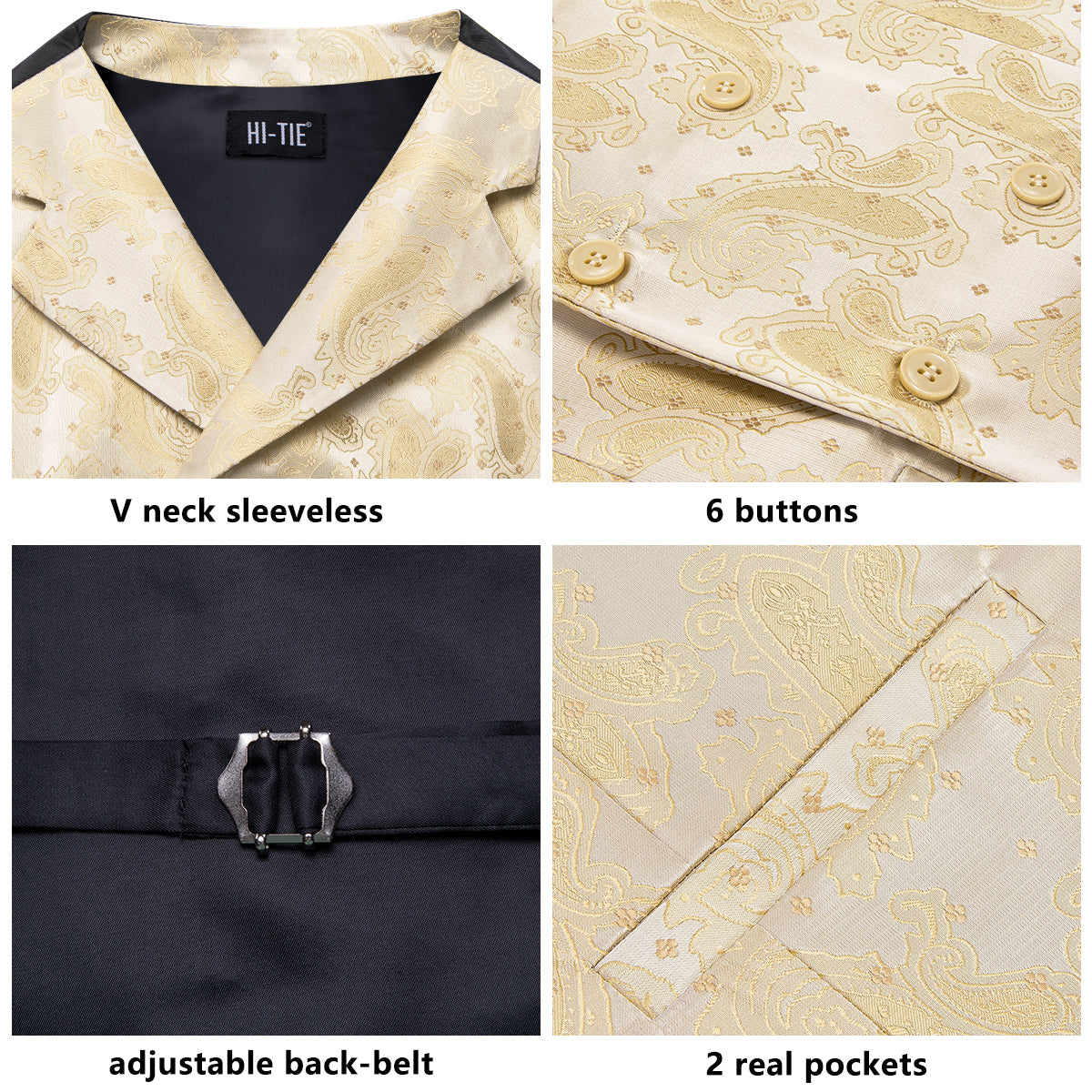 Hi-Tie Beige Yellow Paisley Men's Collar Vest Hanky Cufflinks Tie Set