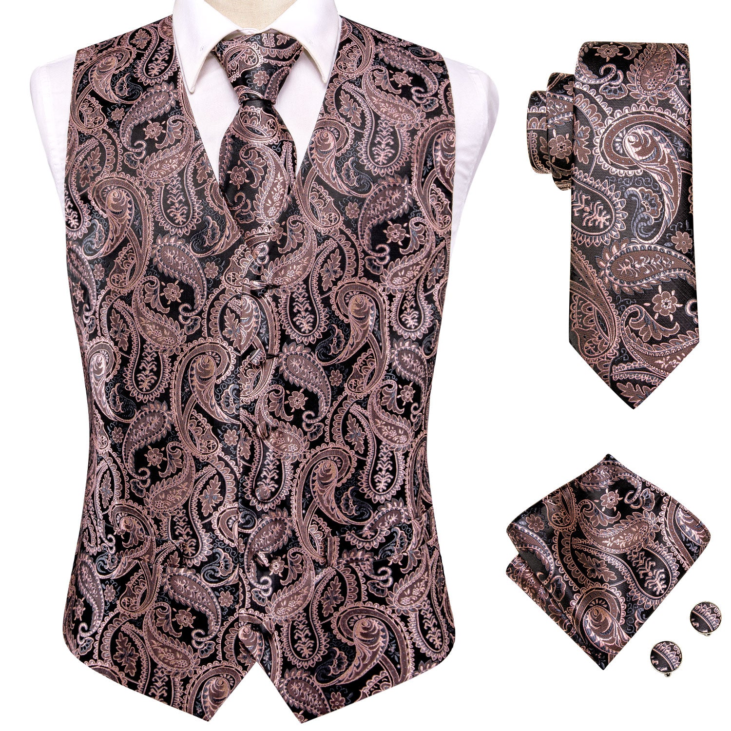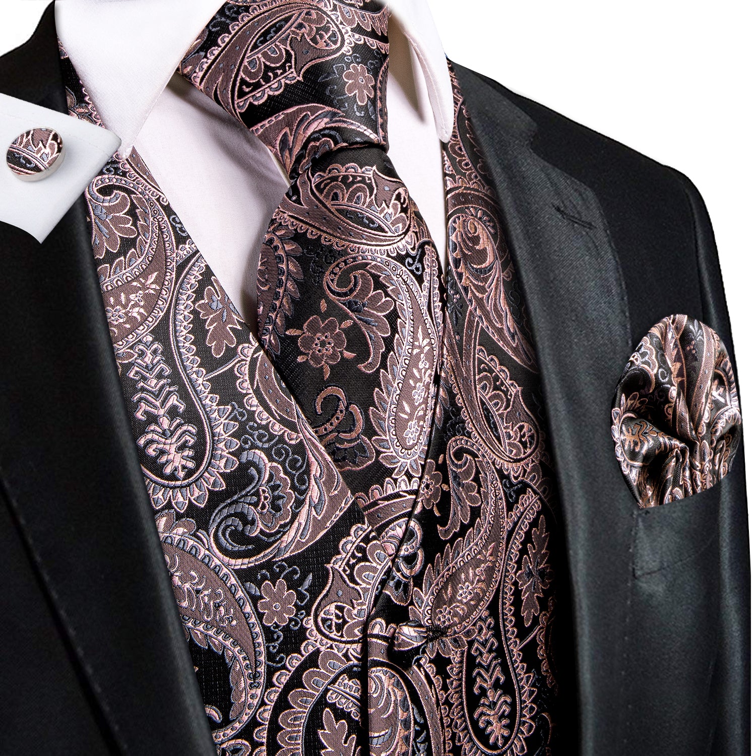 Hi-Tie Black Coral Pink Paisley Silk Men Vest Hanky Cufflinks Tie Set