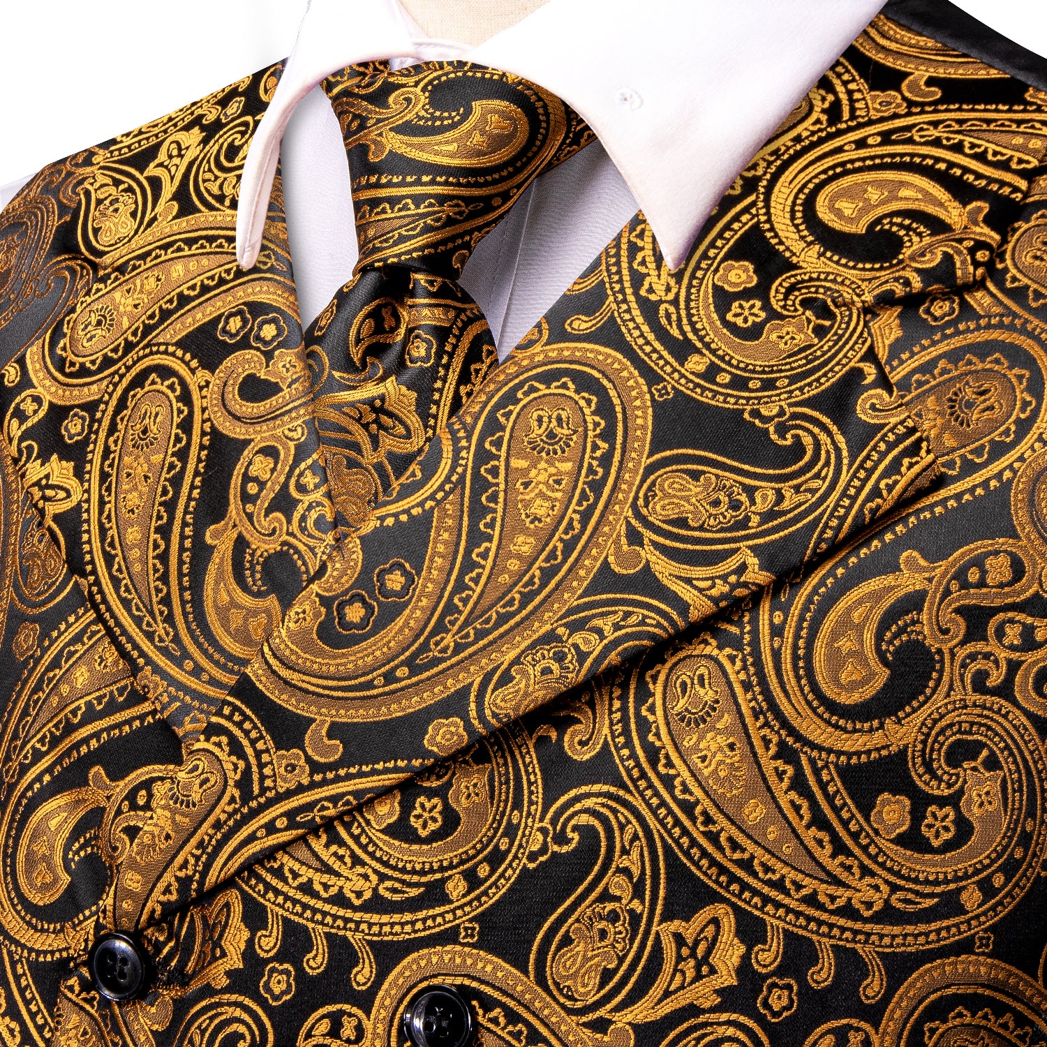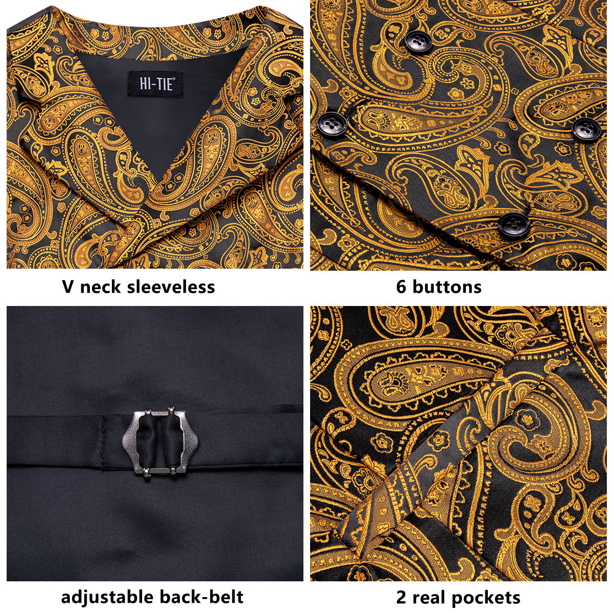 Hi-Tie Black Gold Paisley Men's Collar Vest Hanky Cufflinks Tie Set