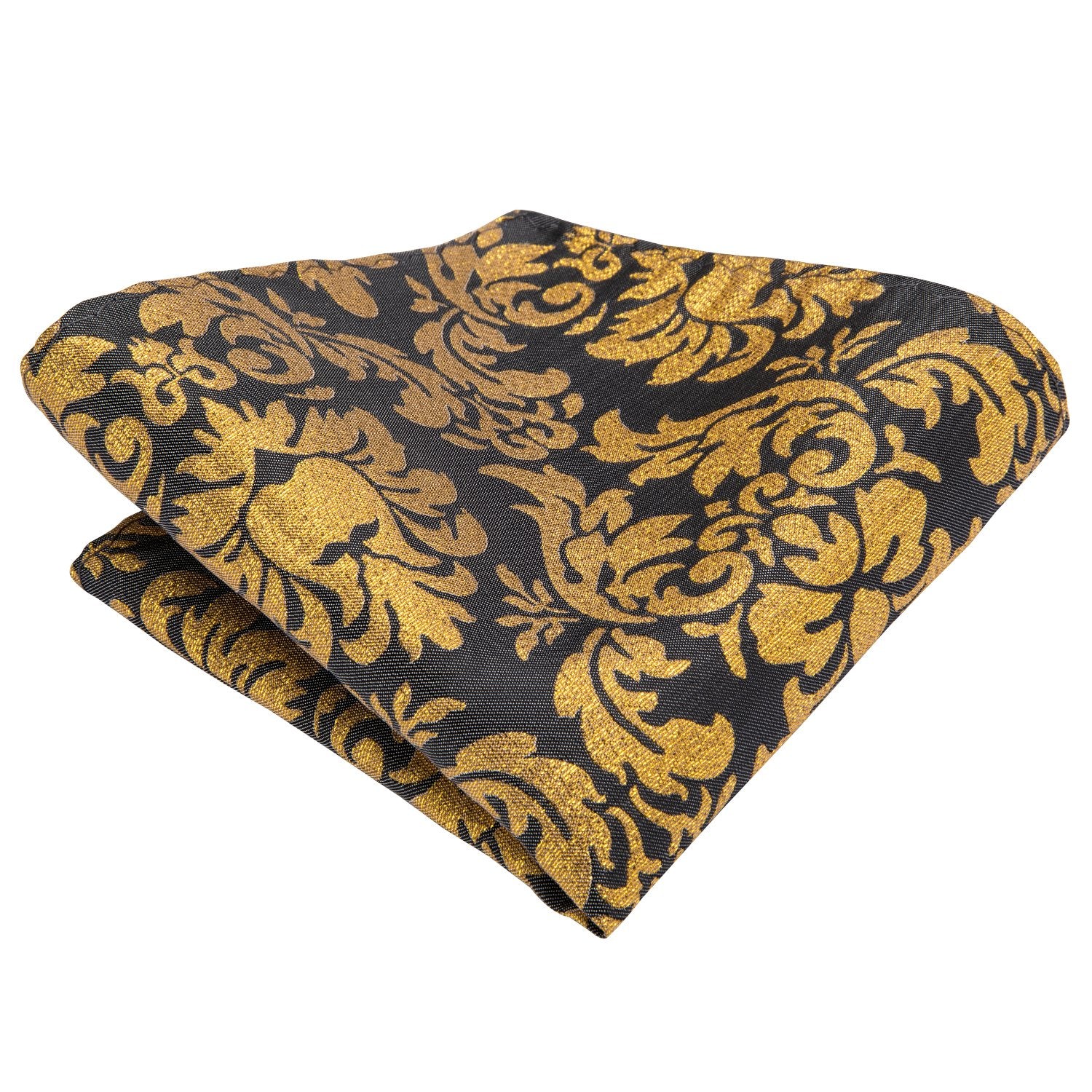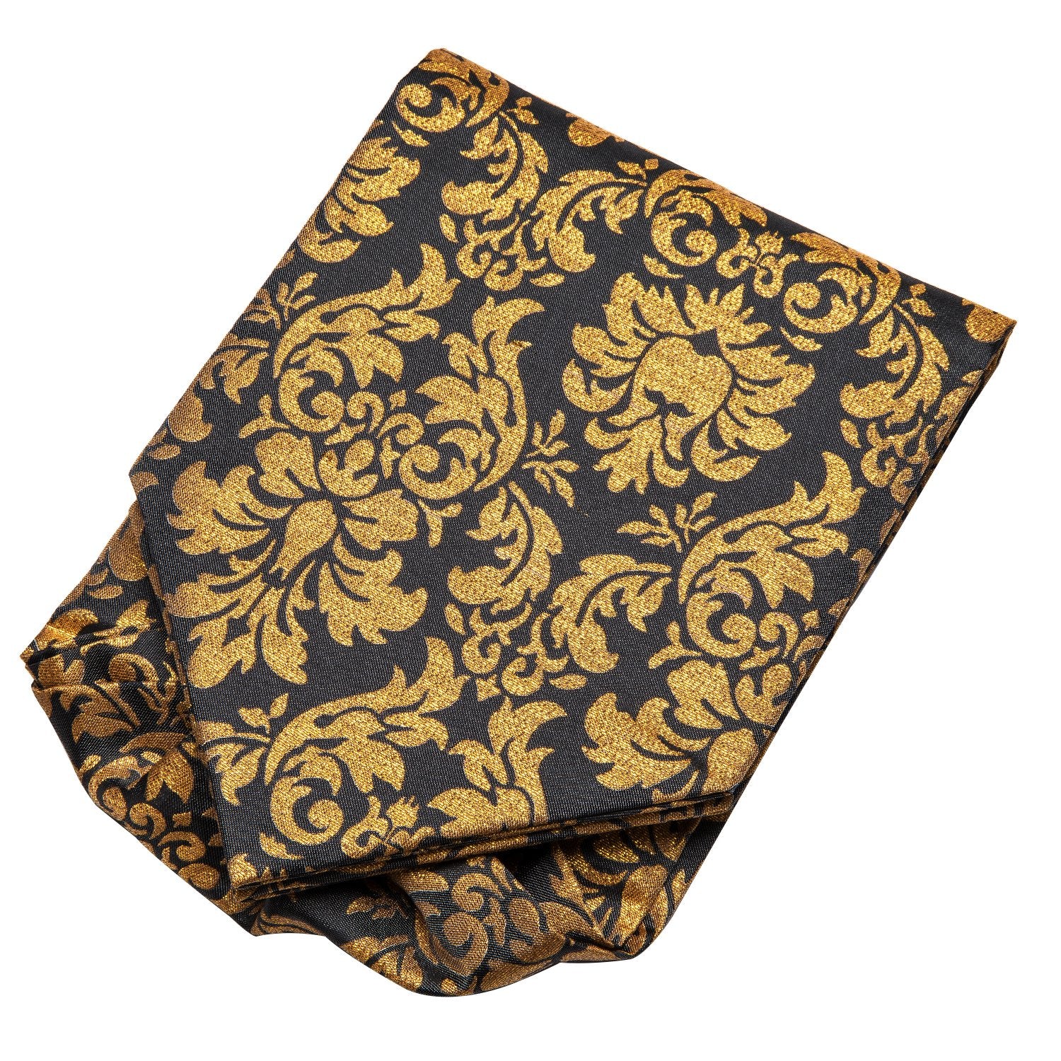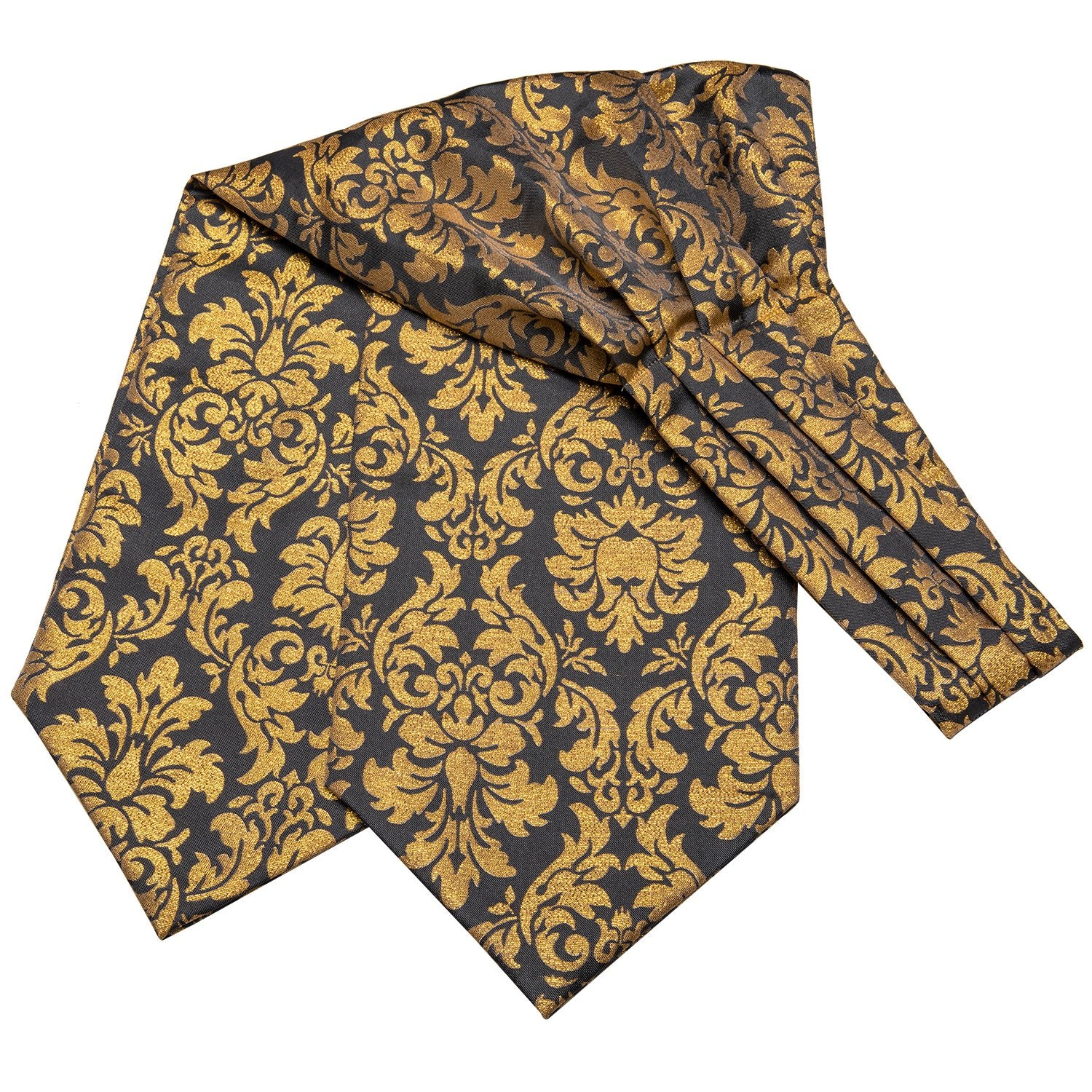 Hi-Tie Black Golden Floral Ascot Tie Pocket Square Cufflinks Set