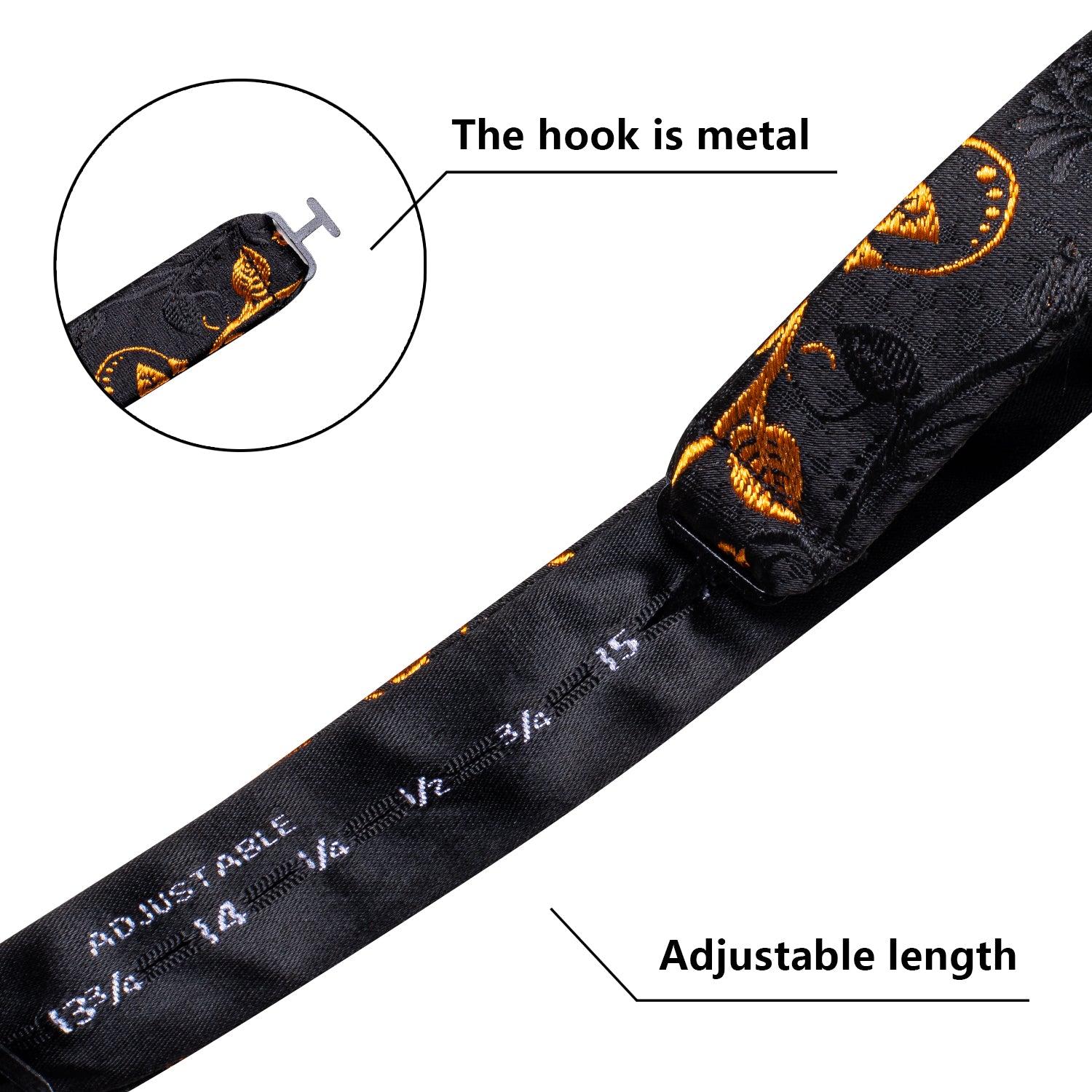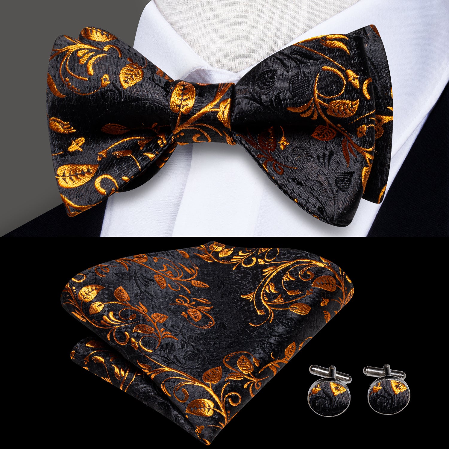 Hi-Tie Black Golden Floral Silk Self-tied Bow Tie Hanky Cufflinks Set