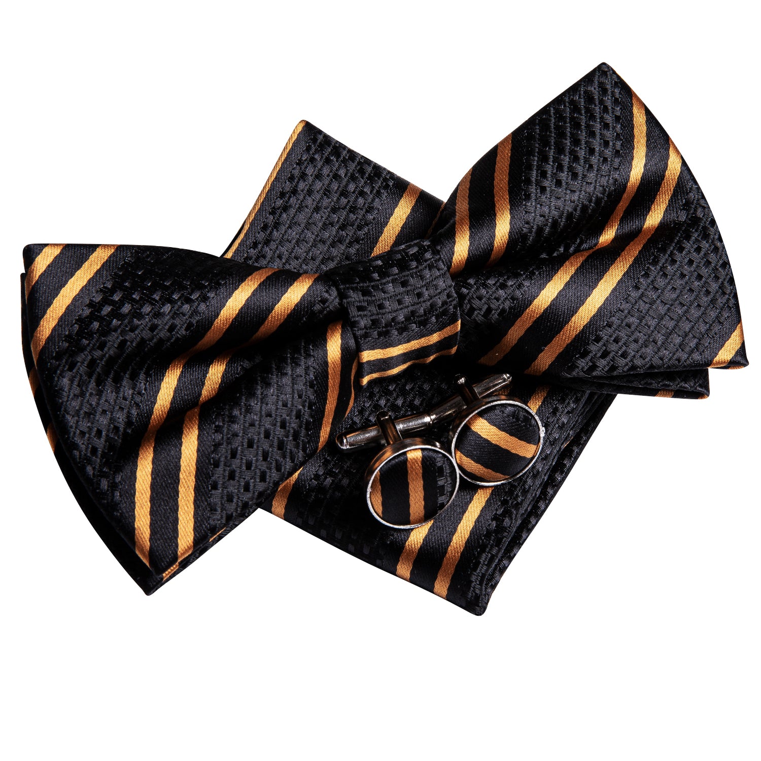 Hi-Tie Black Golden Striped Pre-tied Silk Bow Tie Hanky Cufflinks Set