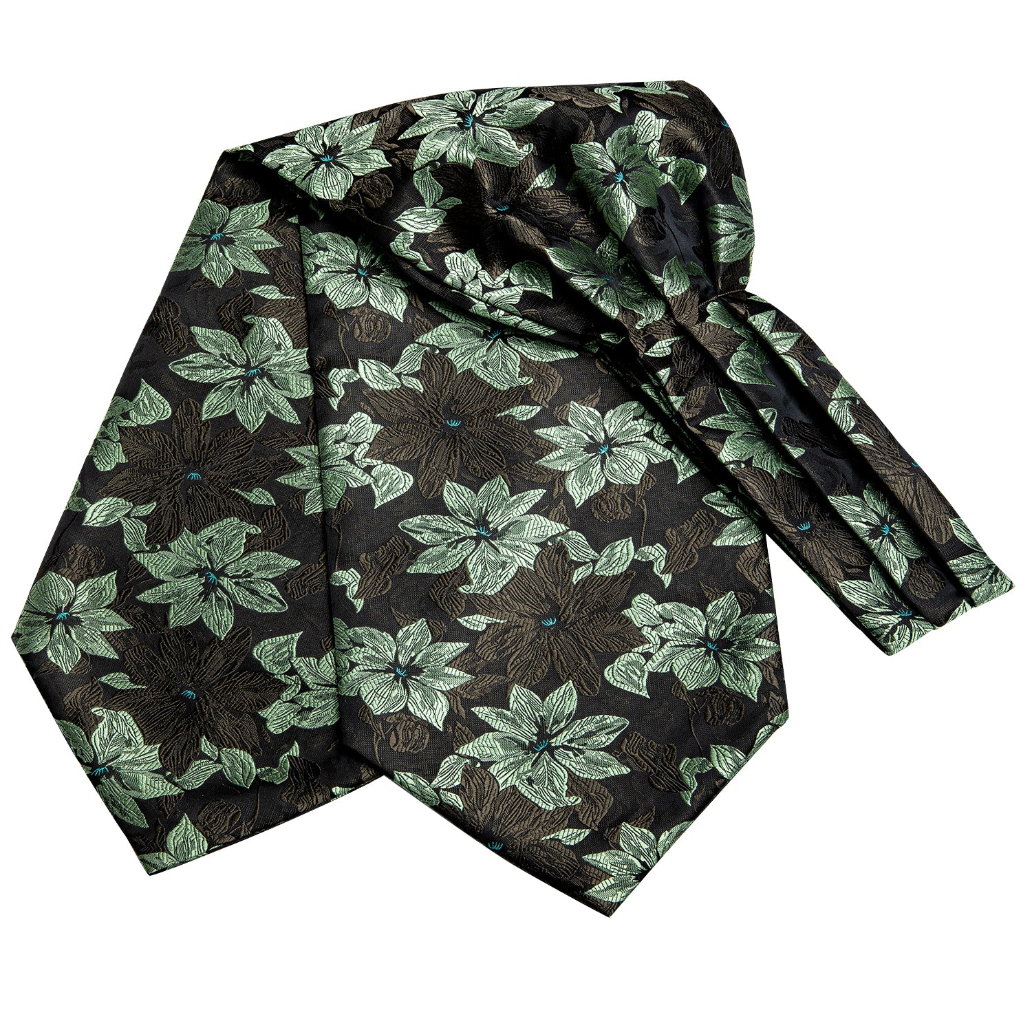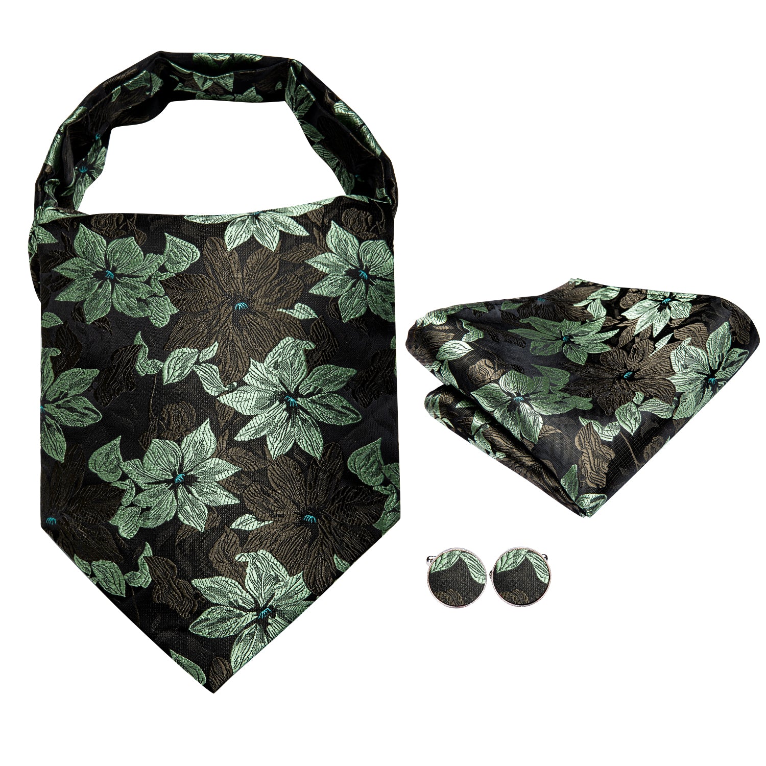 Hi-Tie Black Green Floral Ascot Pocket Square Cufflinks Set