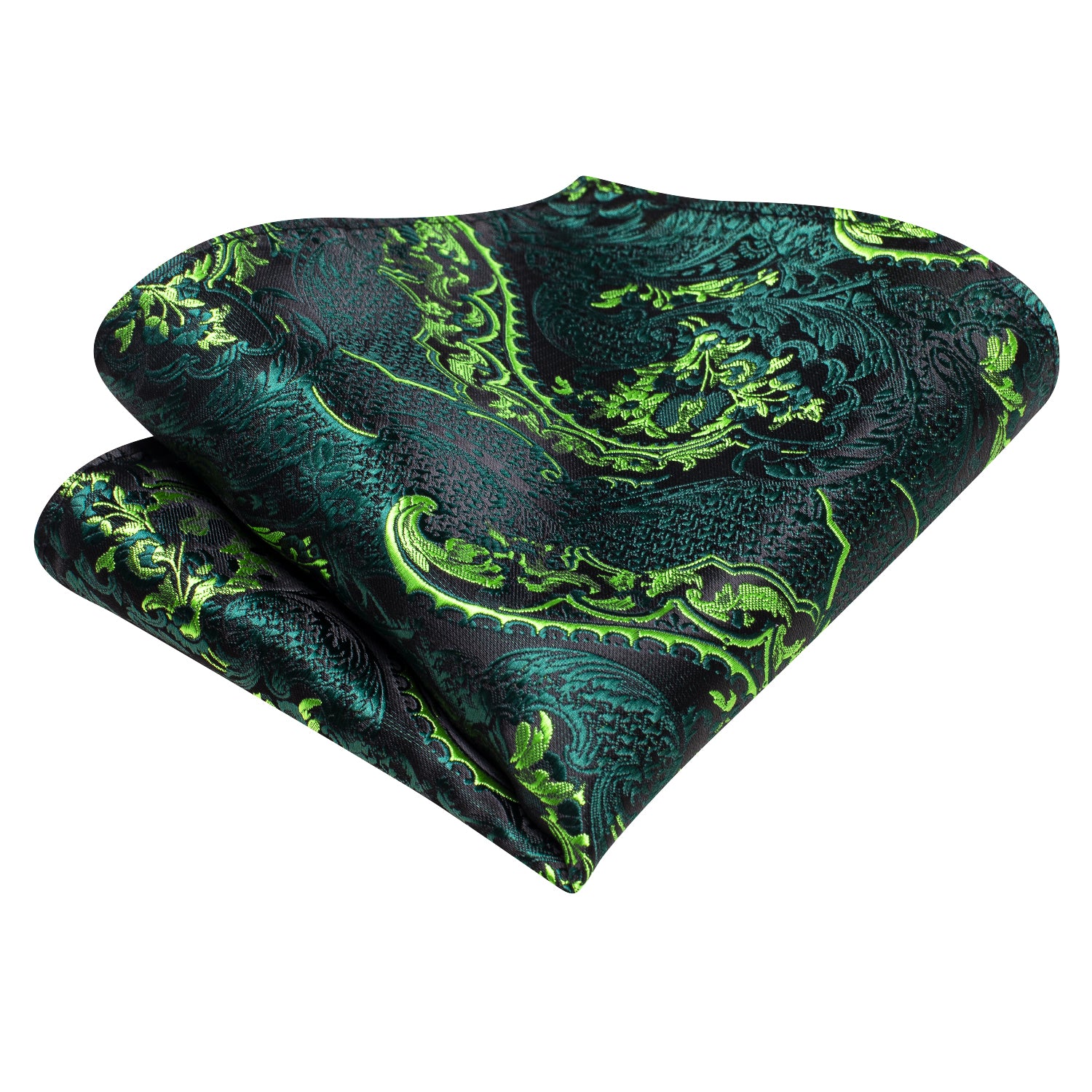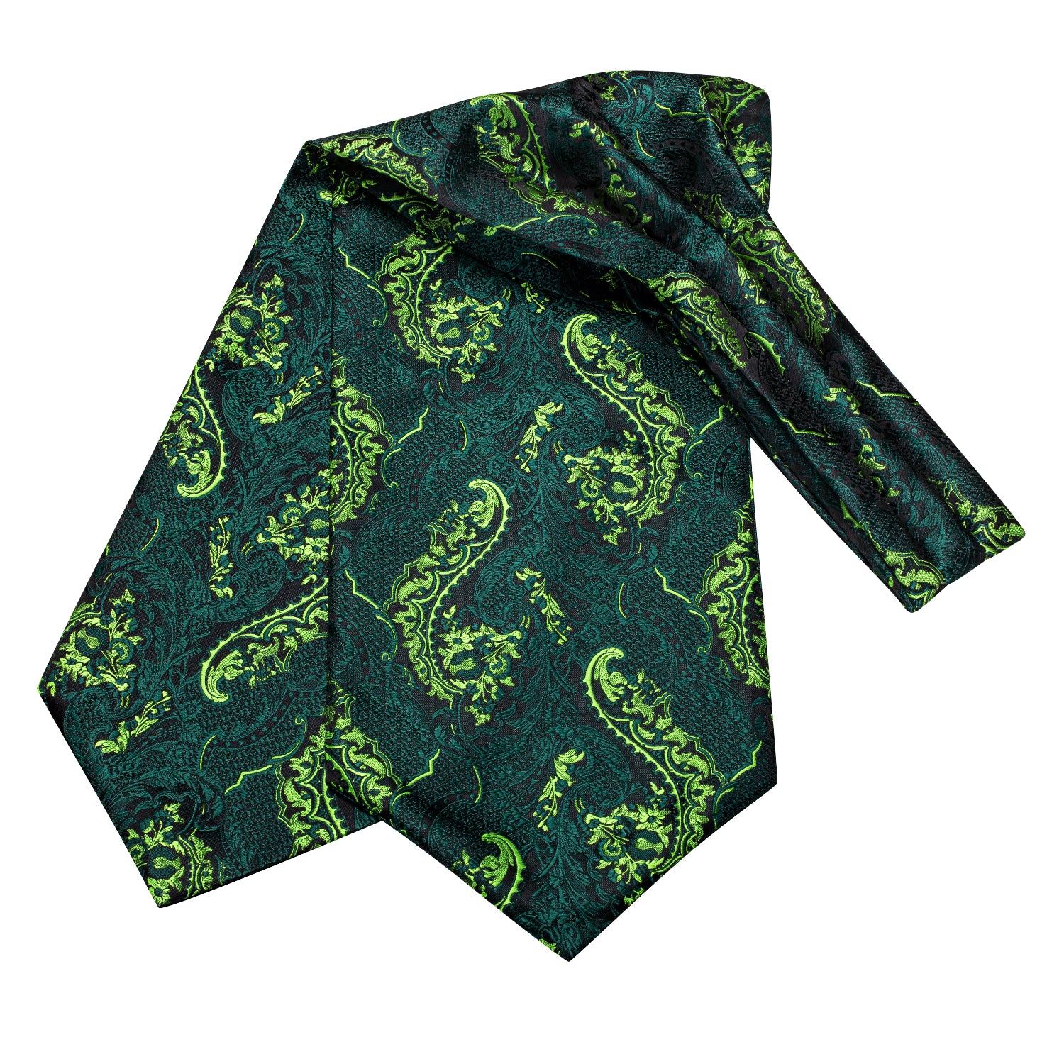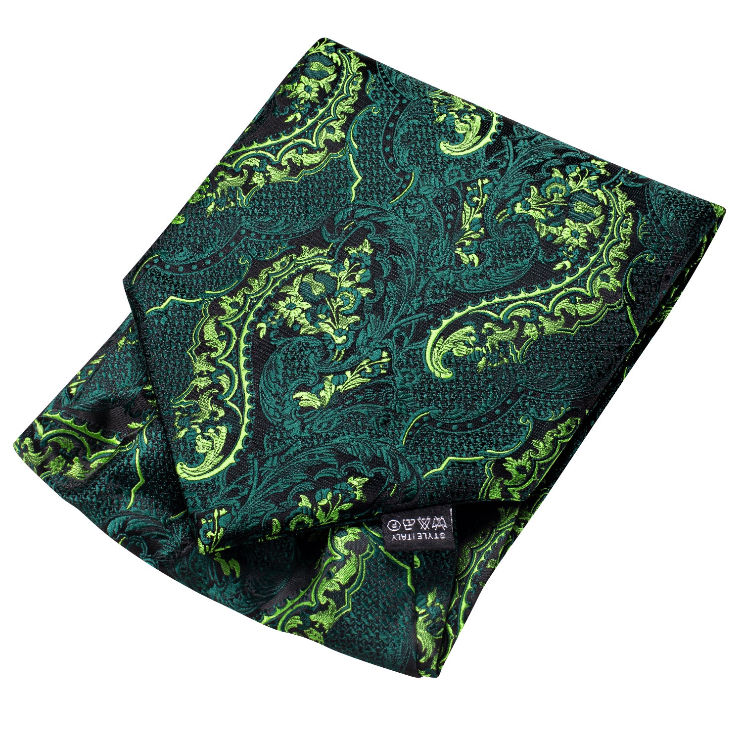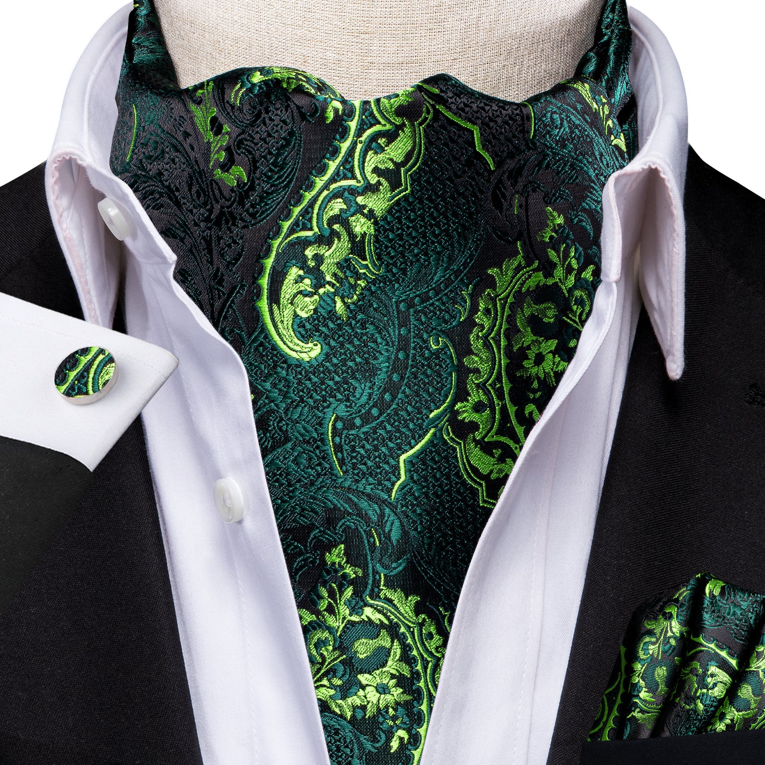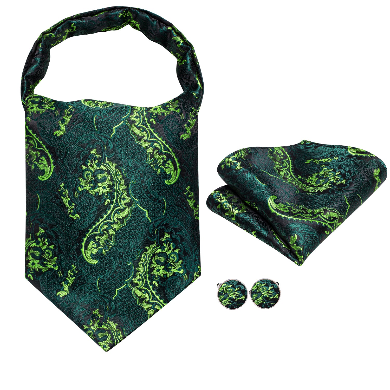 Hi-Tie Black Green Paisley Silk Ascot Tie Pocket Square Cufflinks Set