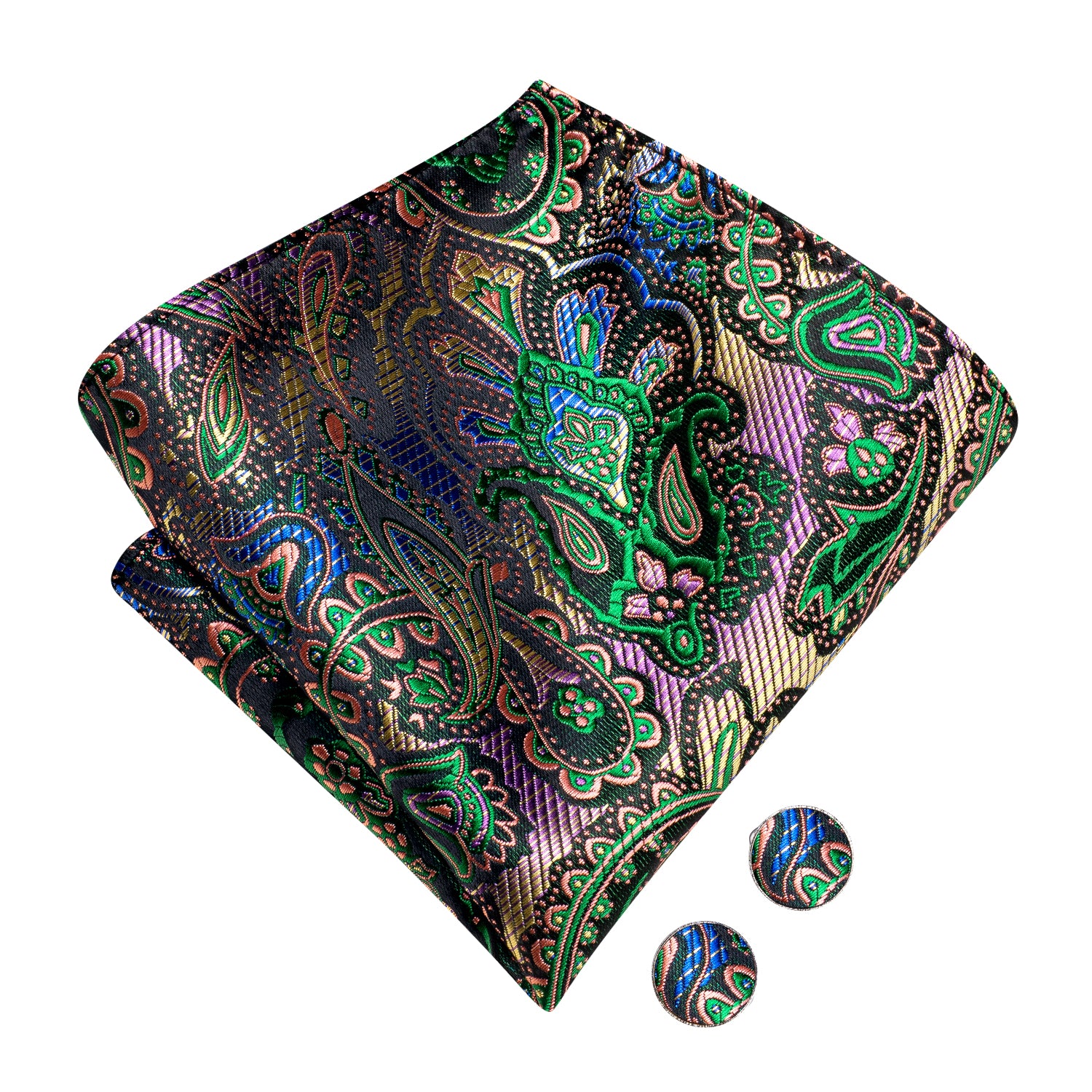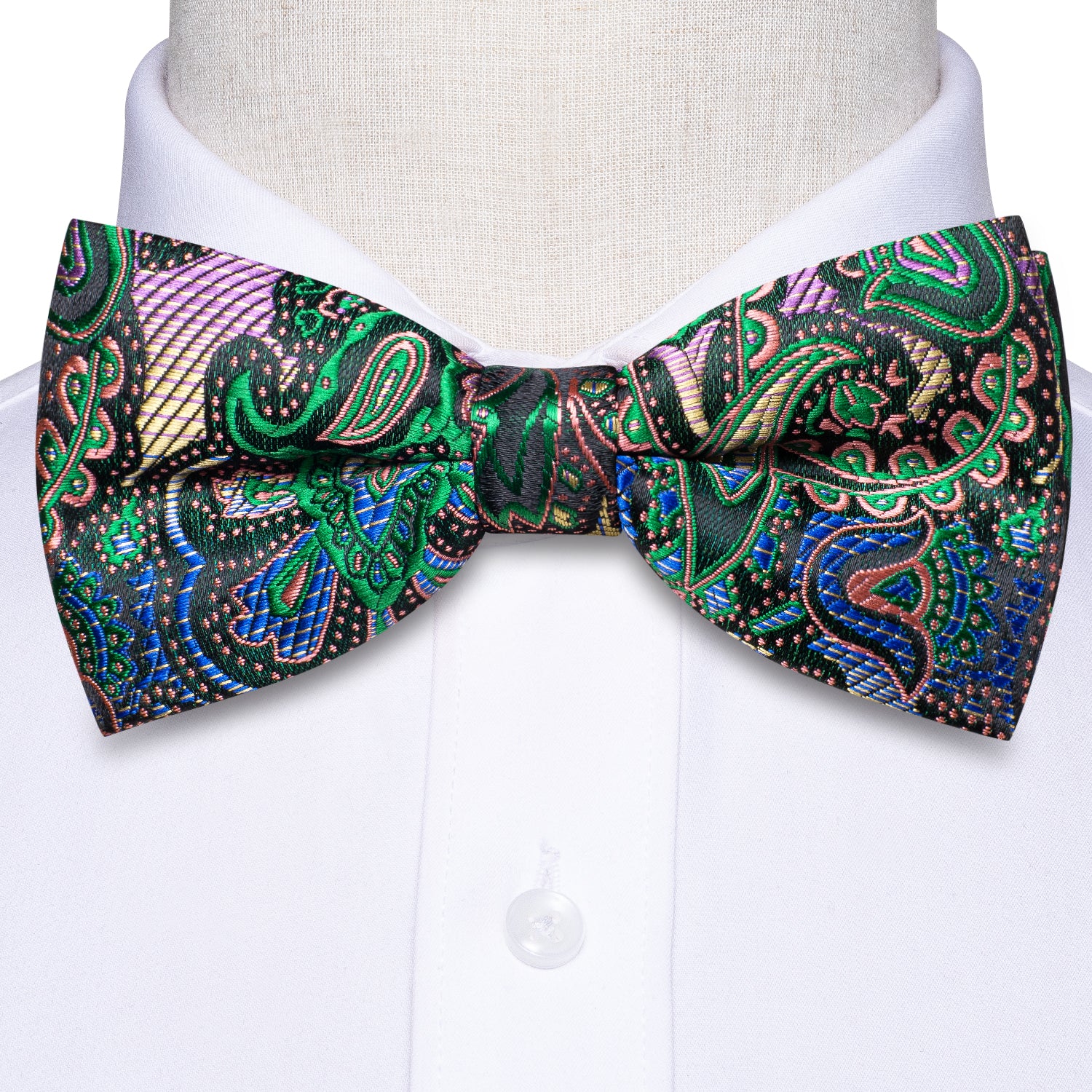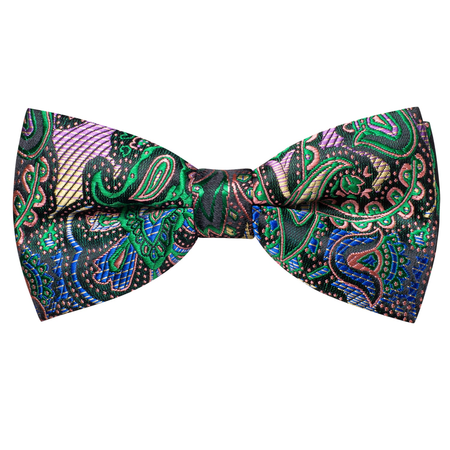 Hi-Tie Black Green Paisley Silk Pre-tied Bow Tie Hanky Cufflinks Set