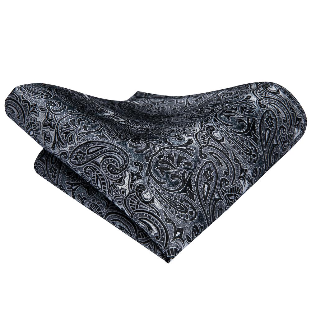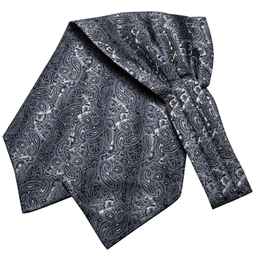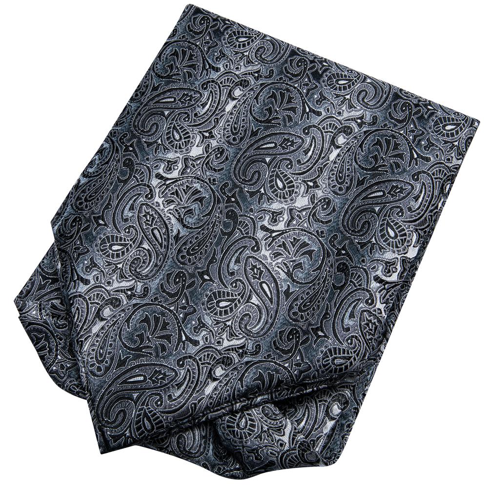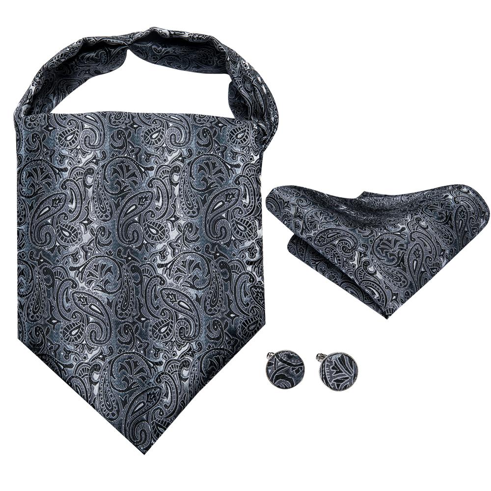 Hi-Tie Black Grey Paisley Ascot Pocket Square Cufflinks Set